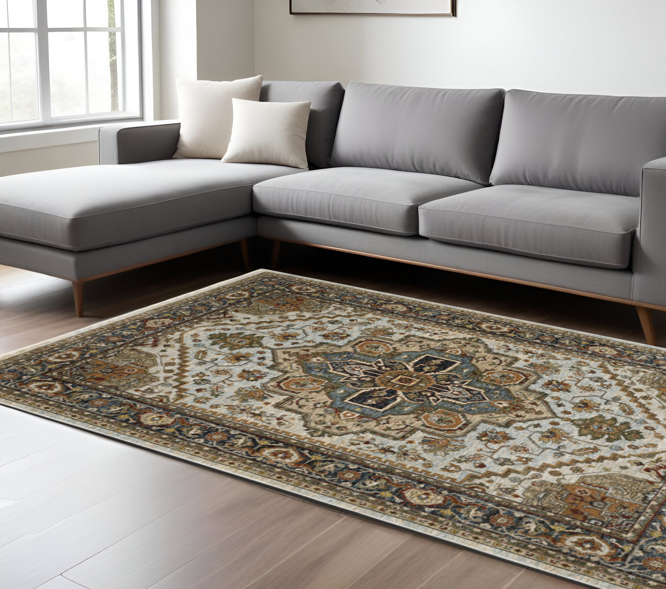 Add some artistry to your room with this 8-foot x 11-foot ivory and blue oriental area rug with fringe. Ideal for spaces with kids and pets, this rug is stain resistant to help repel dirt and spilled liquids. Built to last, this rug crafted from polyester fibers is known for its durability and long lasting appeal. Rugs are a great way to showcase your style, hide imperfections, warm your home and reduce noise. Tassel ends bring a timeless and fashionable look to your interior. 94.49-inch h x 133.86-inch w x 0.24-inch d.