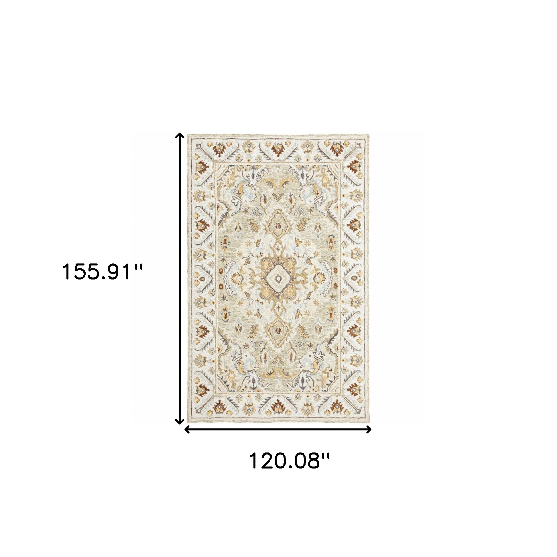 Add some artistry to your room with this 10' x 13' ivory beige gold and muted grey oriental tufted handmade stain resistant area rug. This rectangle shaped rug features a oriental design in ivory beige gold and muted grey to give it visual interest. A classic shape marries with good looking design for your space Ideal for spaces with kids and pets, this rug is stain resistant to help repel stains and spilled liquids. Place this area rug against a hardwood or tile floor and it will enliven your living space with style and sophistication. 0.39" H x 120.08" W x 155.91" D