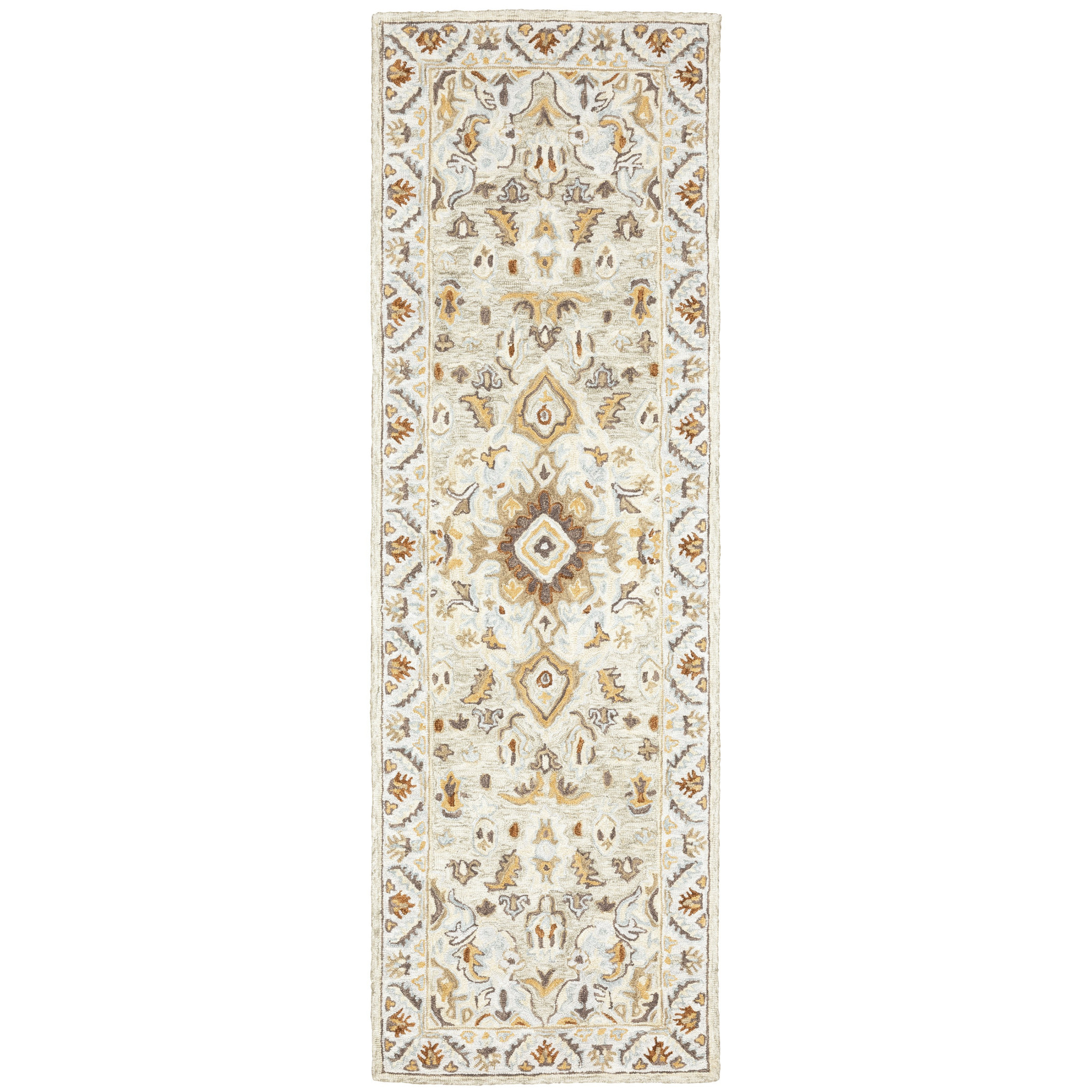 Add great coloration and comfortable texture to your space with this 2' x 8' ivory beige gold and muted grey oriental tufted handmade stain resistant runner rug. This runner shaped rug features a oriental design in ivory beige gold and muted grey to give it visual interest. A classic shape marries with good looking design for your space Ideal for spaces with kids and pets, this rug is stain resistant to help repel stains and spilled liquids. Area Rugs help to give warmth and sense of home to your space. 0.39" H x 29.92" W x 95.67" D
