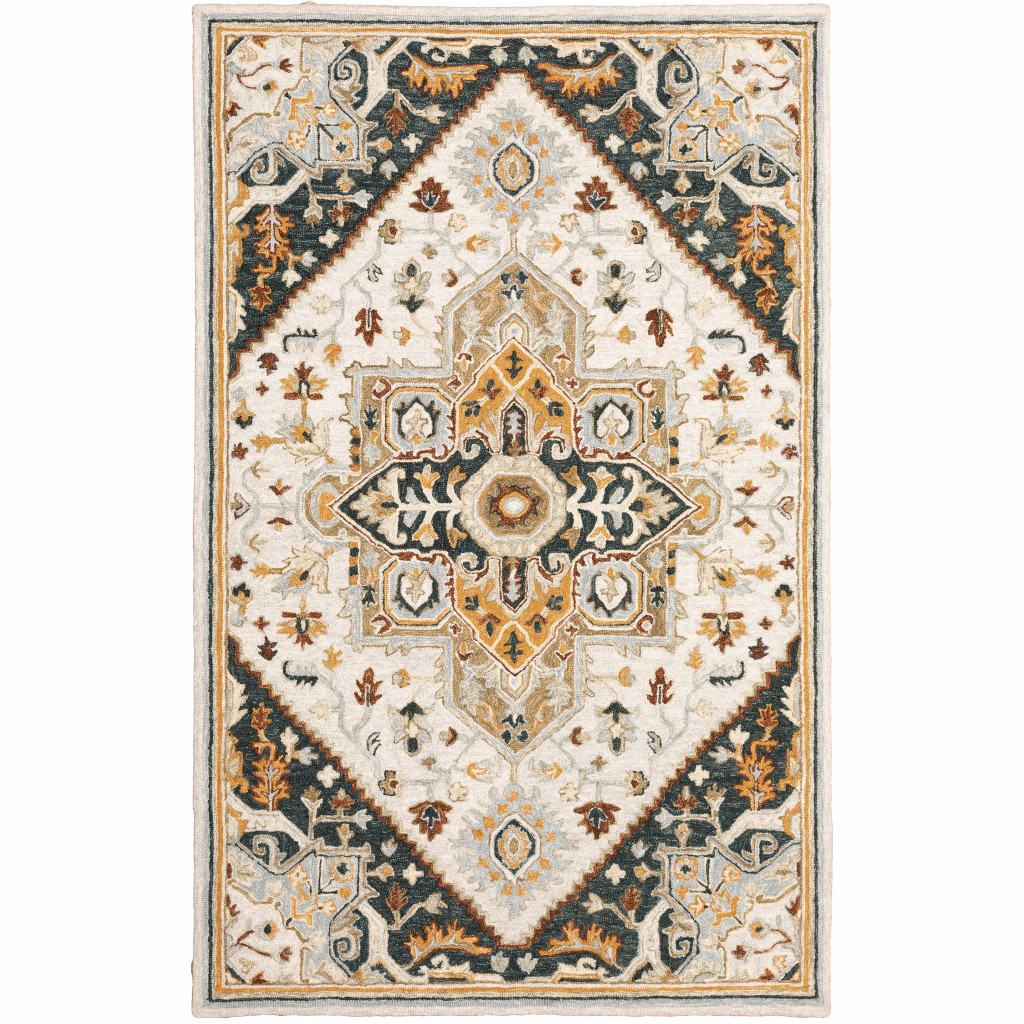 This 5' x 8' ivory charcoal gold clay and muted blue oriental tufted handmade stain resistant area rug, is a great way to add warmth to a room. This rectangle shaped rug features a oriental design in ivory charcoal gold clay and muted blue to give it visual interest. A classic shape marries with good looking design for your space Ideal for spaces with kids and pets, this rug is stain resistant to help repel stains and spilled liquids. Area Rugs help to give warmth and sense of home to your space. 0.39" H x 59.84" W x 96.06" D