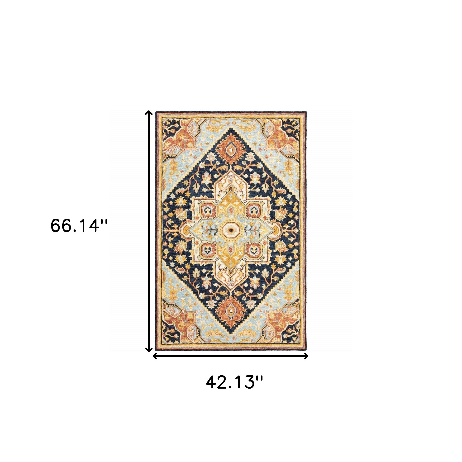 Add great coloration and comfortable texture to your space with this 4' x 6' navy rust blue ivory and gold oriental tufted handmade stain resistant area rug. This rectangle shaped rug features a oriental design in navy rust blue ivory and gold to give it visual interest. A classic shape marries with good looking design for your space Ideal for spaces with kids and pets, this rug is stain resistant to help repel stains and spilled liquids. Area Rugs help to give warmth and sense of home to your space. 0.39" H x 42.13" W x 66.14" D