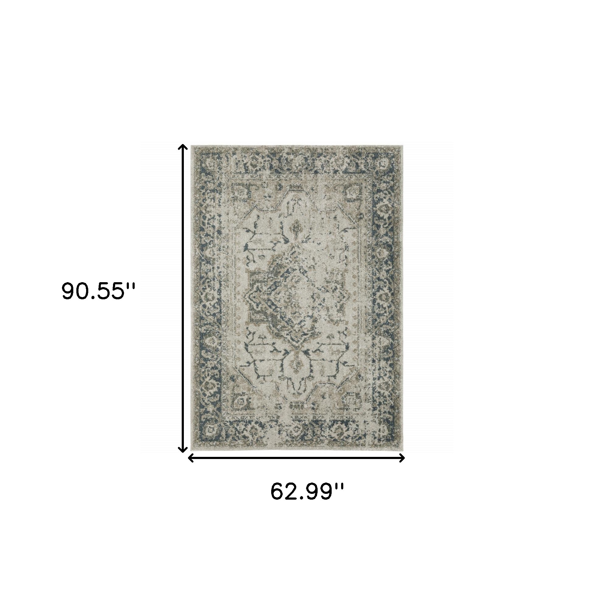 This 5-foot x 8-foot beige and blue oriental distressed area rug, is a great way to add warmth to a room. Ideal for spaces with kids and pets, this rug is stain resistant to help repel dirt and spilled liquids. Built to last, this rug crafted from polyester fibers is known for its durability and long lasting appeal. Rugs are a great way to showcase your style, hide imperfections, warm your home and reduce noise. 62.99-inch h x 90.55-inch w x 0.71-inch d.