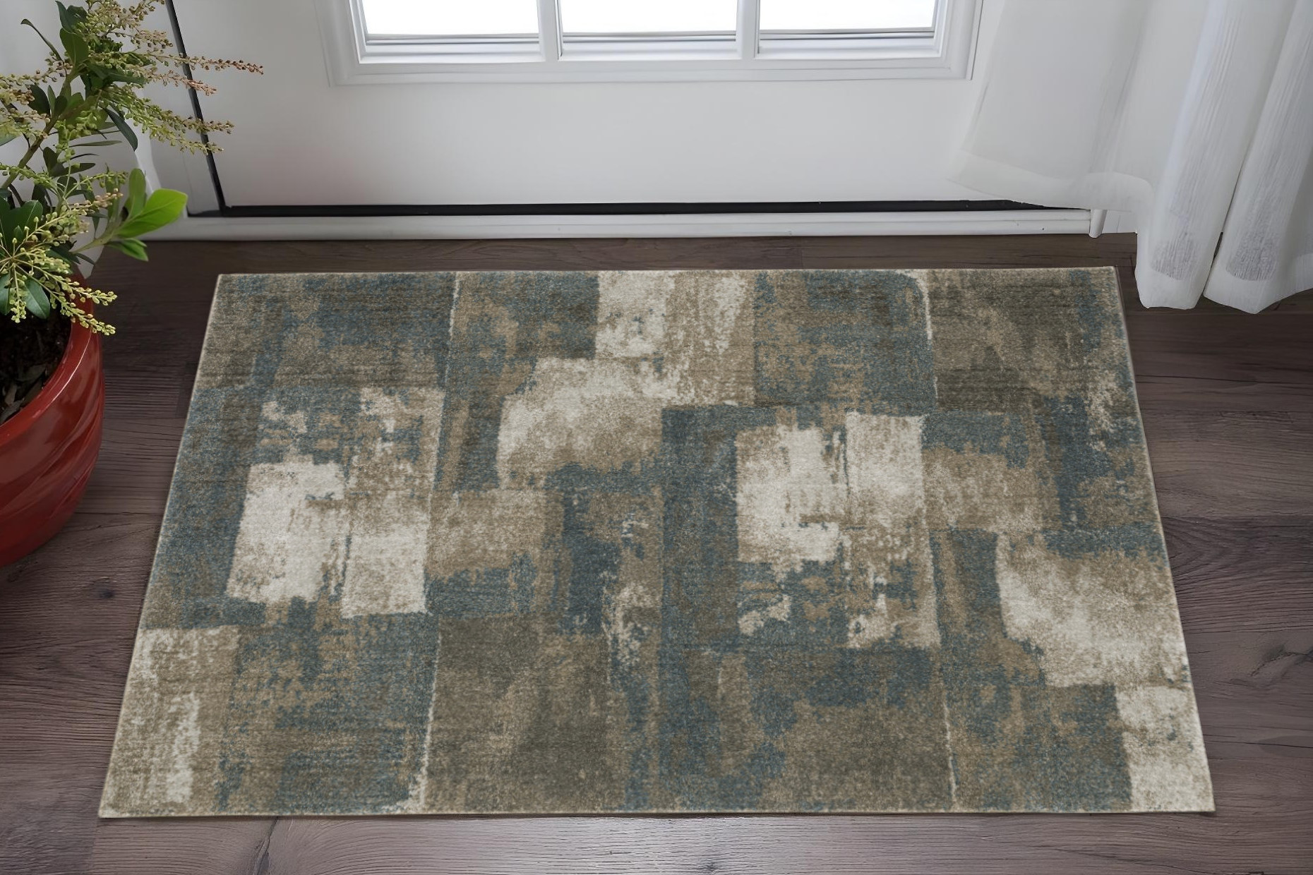 This 3-foot x 5-foot teal blue geometric power loom area rug, is a great way to add warmth to a room. This rectangle shaped rug features a geometric design in teal blue to give it visual interest. A classic shape marries with good looking design for your space ideal for spaces with kids and pets, this rug is stain resistant to help repel stains and spilled liquids. Area rugs help to give warmth and sense of home to your space. 39.37-inch H x 59.84-inch W x 0.71-inch D