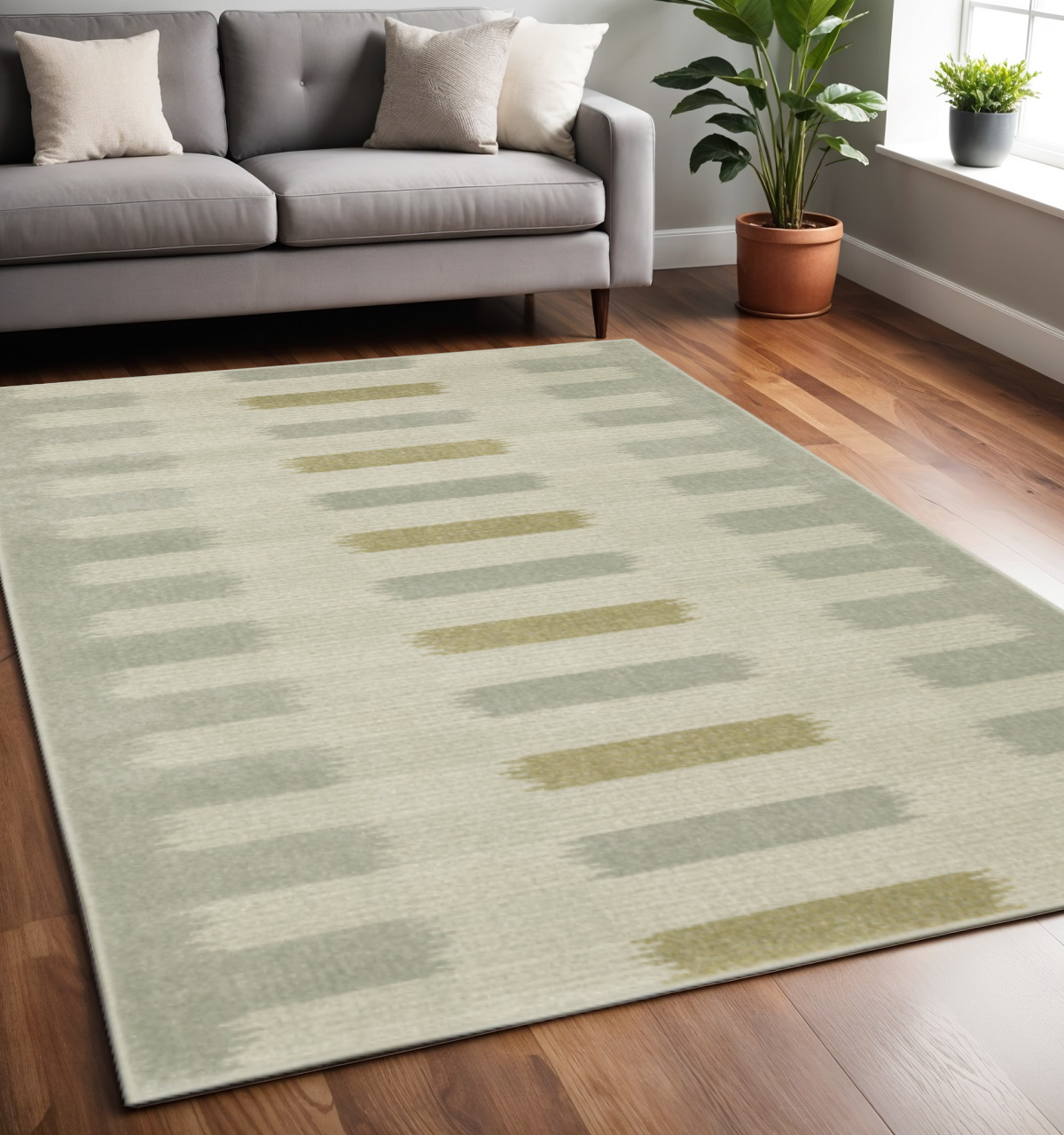 This 5' x 7' beige grey gold and green geometric power loom stain resistant area rug, is a great way to add warmth to a room. This rectangle shaped rug features a geometric design in beige grey gold and green to give it visual interest. A classic shape marries with good looking design for your space Ideal for spaces with kids and pets, this rug is stain resistant to help repel stains and spilled liquids. Place this area rug against a hardwood or tile floor and it will enliven your living space with style and sophistication. 0.39" H x 62.99" W x 86.61" D