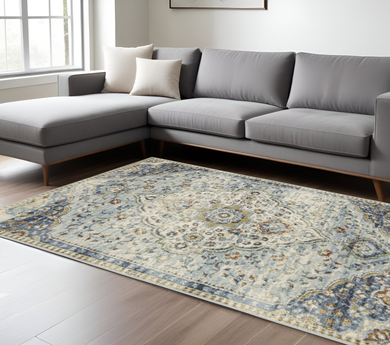Set an inviting tone in your space with this 7-foot x 9-foot blue and beige oriental distressed area rug. Ideal for spaces with kids and pets, this rug is stain resistant to help repel dirt and spilled liquids. Built to last, this rug crafted from polypropylene fibers is known for its durability and long lasting appeal. Rugs are a great way to showcase your style, hide imperfections, warm your home and reduce noise. 78.74-inch h x 110.24-inch w x 0.39-inch d.