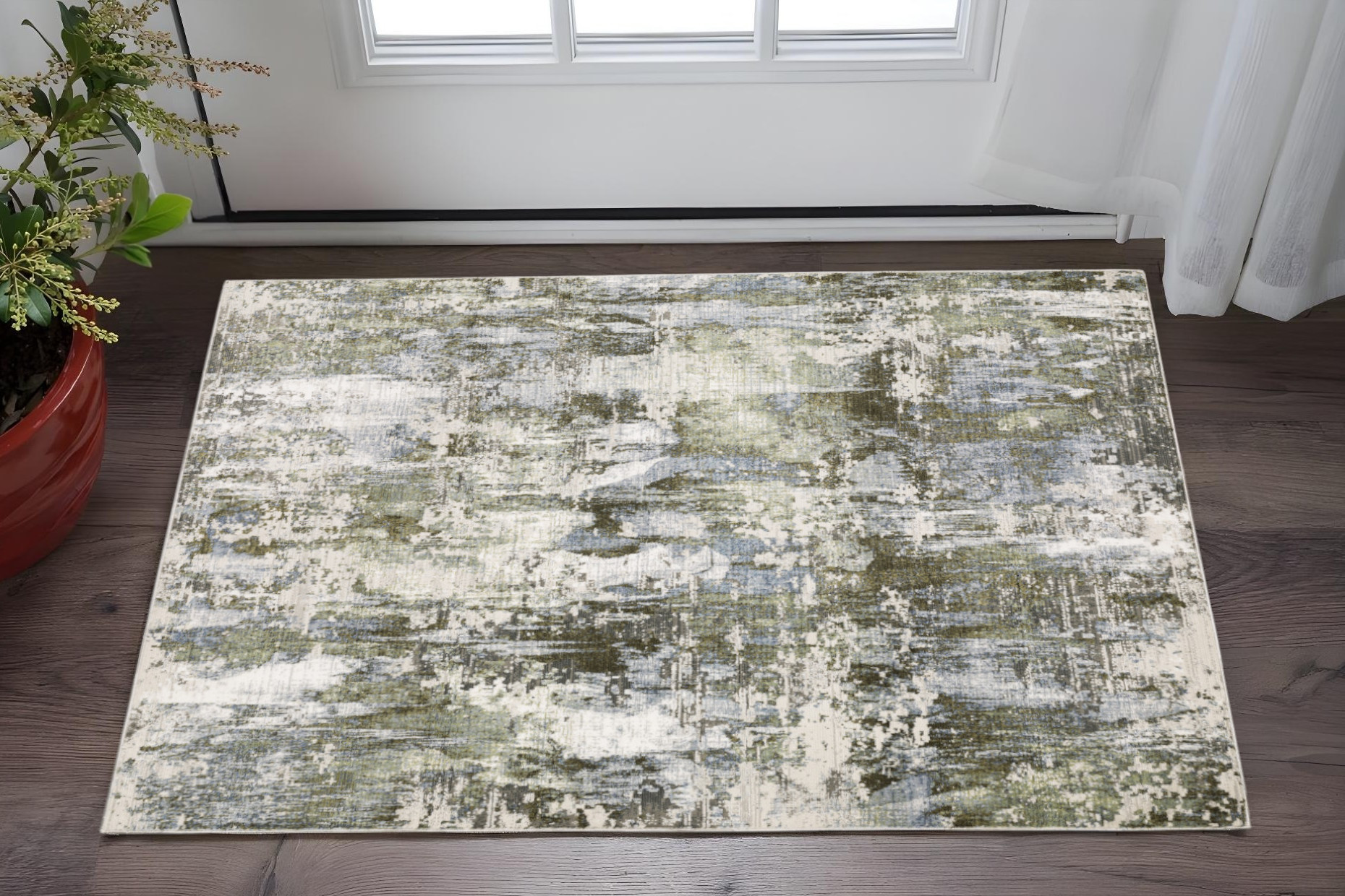 Add great coloration and comfortable texture to your space with this 3' x 5' green blue grey ivory and brown abstract power loom stain resistant area rug. This rectangle shaped rug features a abstract design in green blue grey ivory and brown to give it visual interest. A classic shape marries with good looking design for your space Ideal for spaces with kids and pets, this rug is stain resistant to help repel stains and spilled liquids. Area Rugs help to give warmth and sense of home to your space. 0.31" H x 39.37" W x 60.24" D