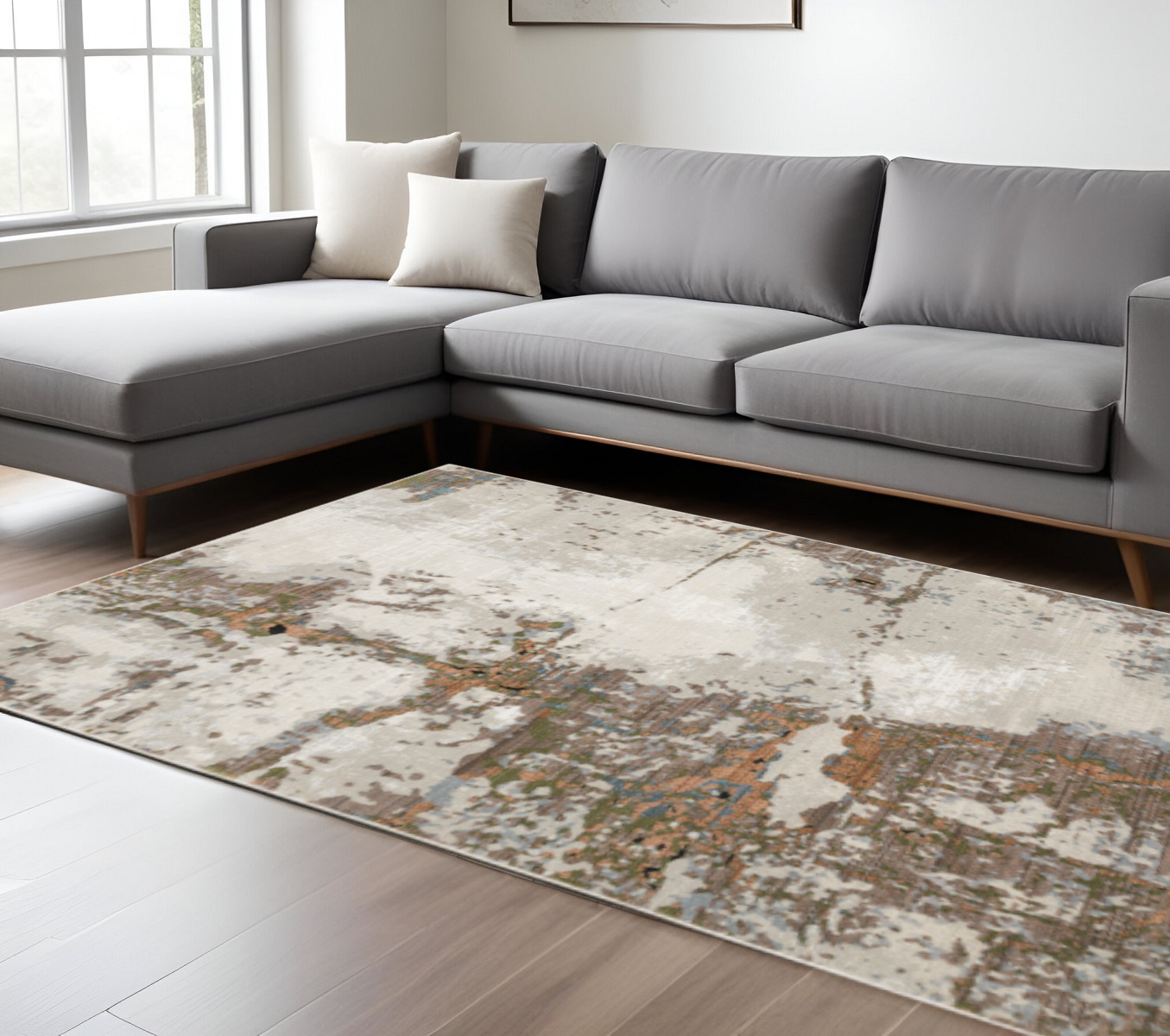 Add some artistry to your room with this 10' x 13' grey salmon pink blue beige and green abstract power loom stain resistant area rug. This rectangle shaped rug features a abstract design in grey salmon pink blue beige and green to give it visual interest. A classic shape marries with good looking design for your space Ideal for spaces with kids and pets, this rug is stain resistant to help repel stains and spilled liquids. Area Rugs help to give warmth and sense of home to your space. 0.31" H x 118.11" W x 155.12" D