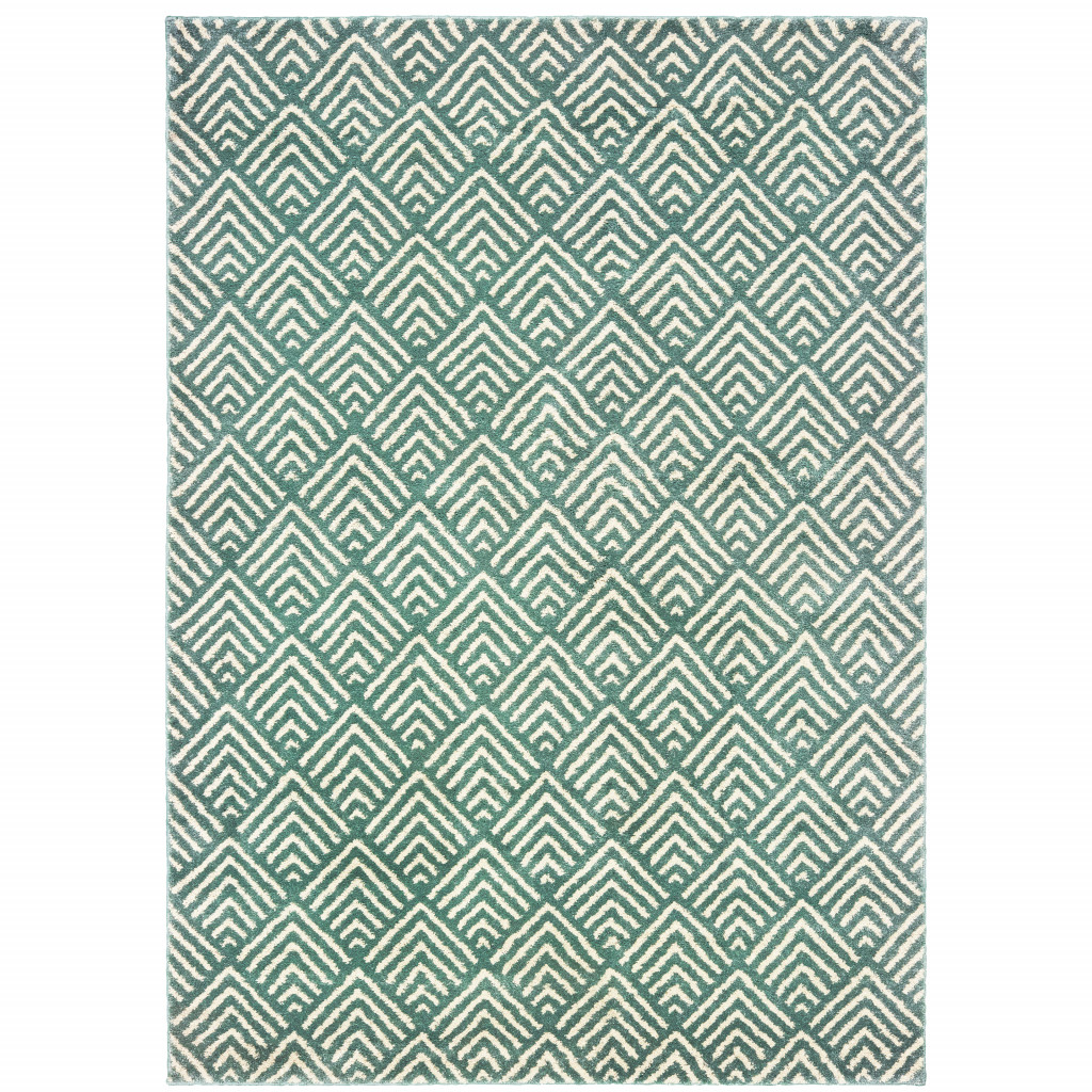 This 10' x 13' foam blue and ivory geometric power loom stain resistant area rug, is a great way to add warmth to a room. This rectangle shaped rug features a geometric design in foam blue and ivory to give it visual interest. A classic shape marries with good looking design for your space Ideal for spaces with kids and pets, this rug is stain resistant to help repel stains and spilled liquids. Area Rugs help to give warmth and sense of home to your space. 0.78" H x 118.11" W x 153.54" D