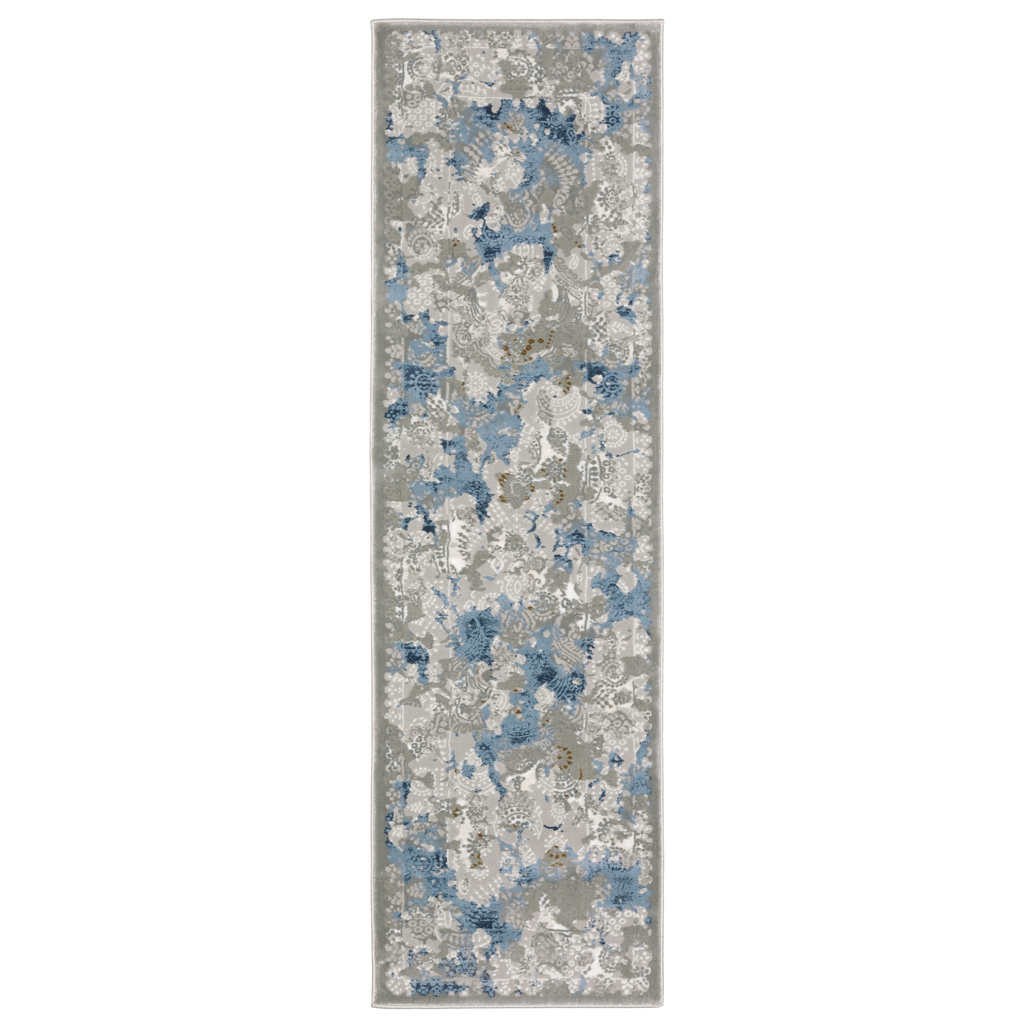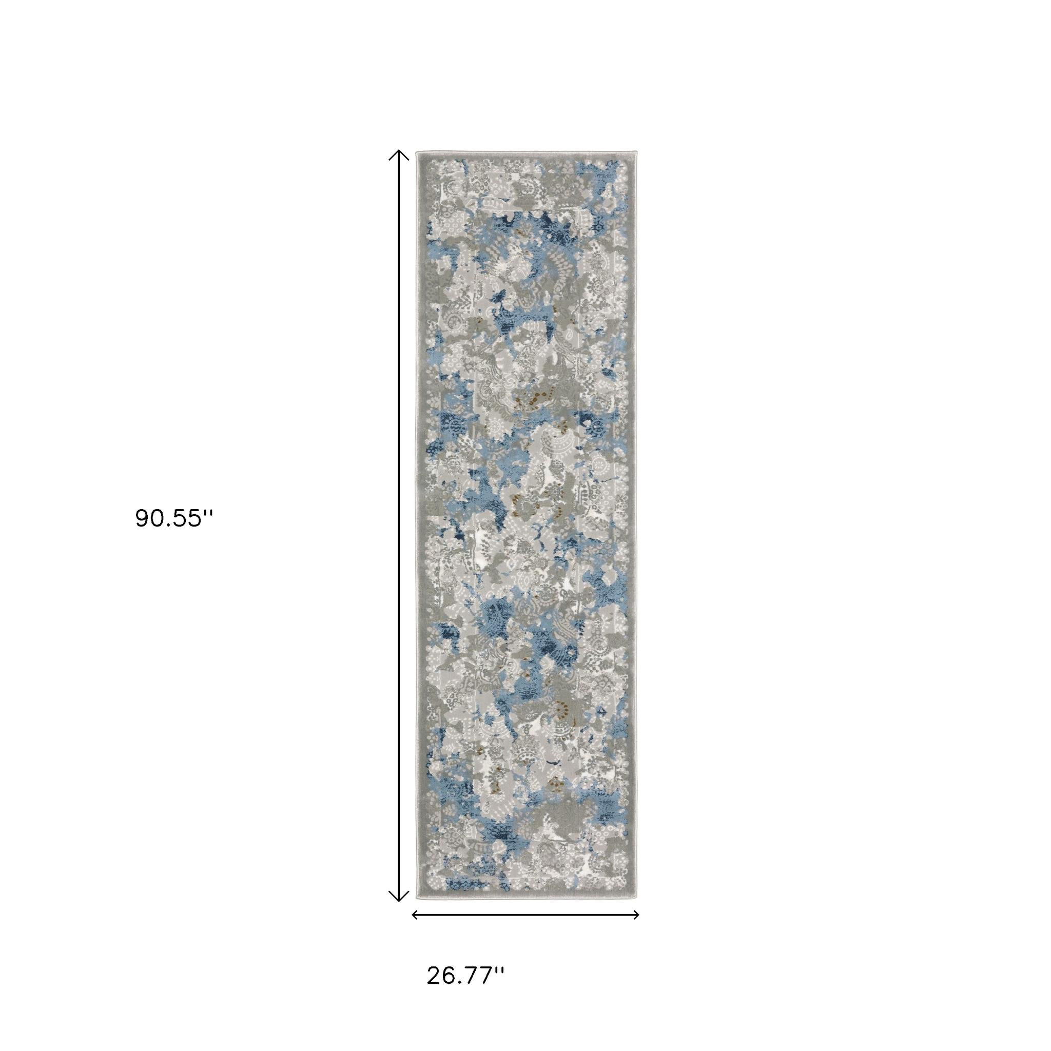 This 2' x 8' grey blue ivory navy beige and brown abstract power loom stain resistant runner rug, is a great way to add warmth to a room. This runner shaped rug features a abstract design in grey blue ivory navy beige and brown to give it visual interest. A classic shape marries with good looking design for your space Ideal for spaces with kids and pets, this rug is stain resistant to help repel stains and spilled liquids. Place this area rug against a hardwood or tile floor and it will enliven your living space with style and sophistication. 1" H x 26.77" W x 90.55" D