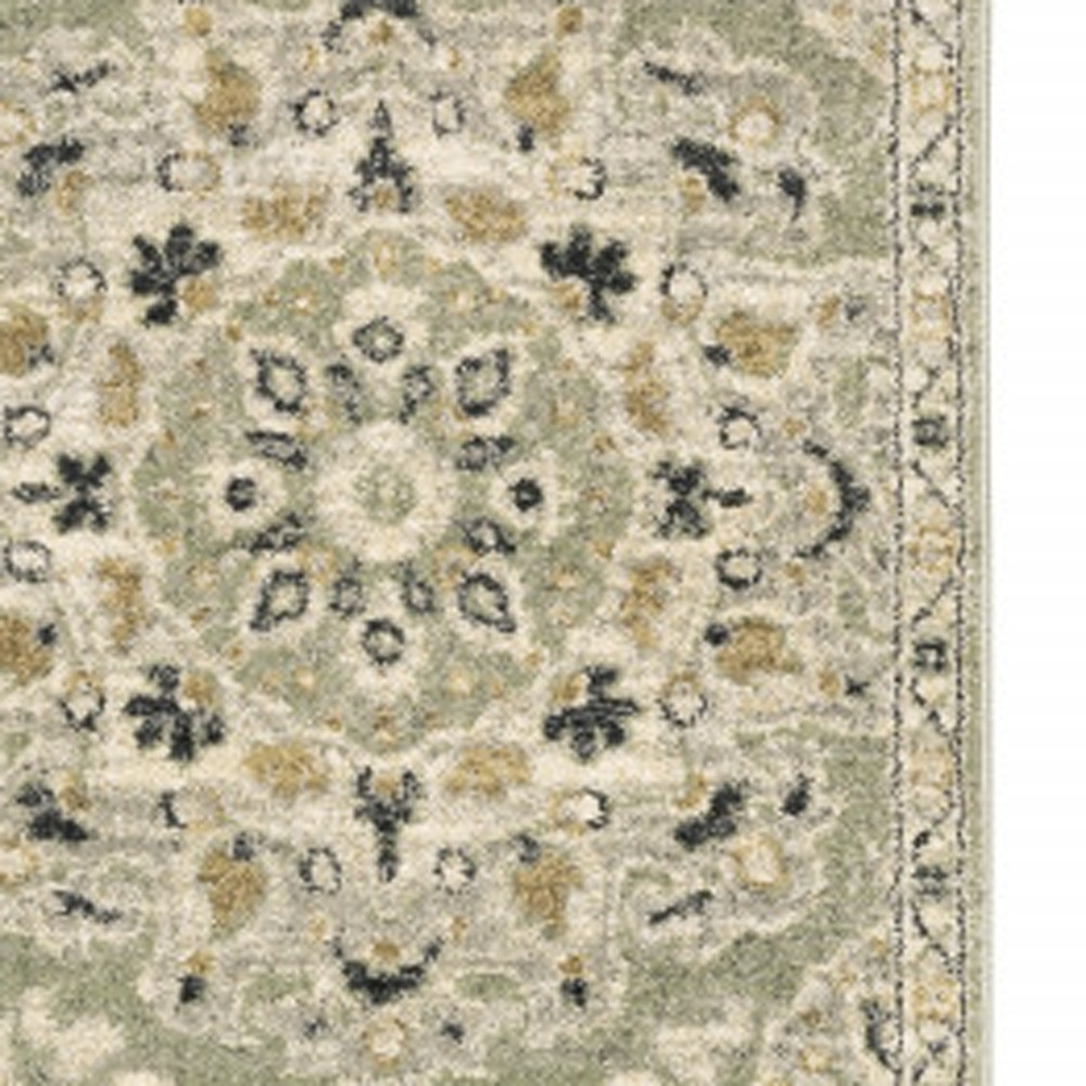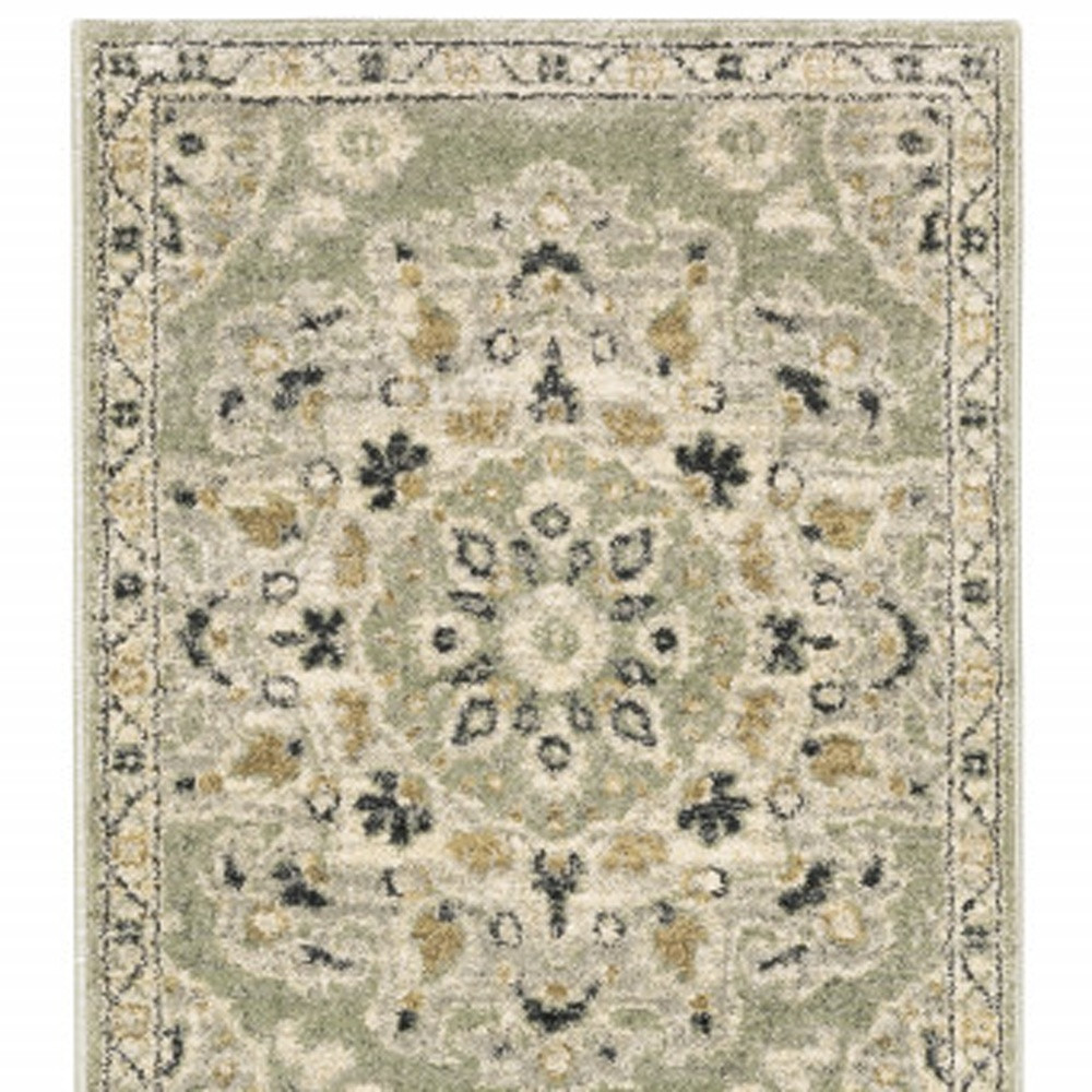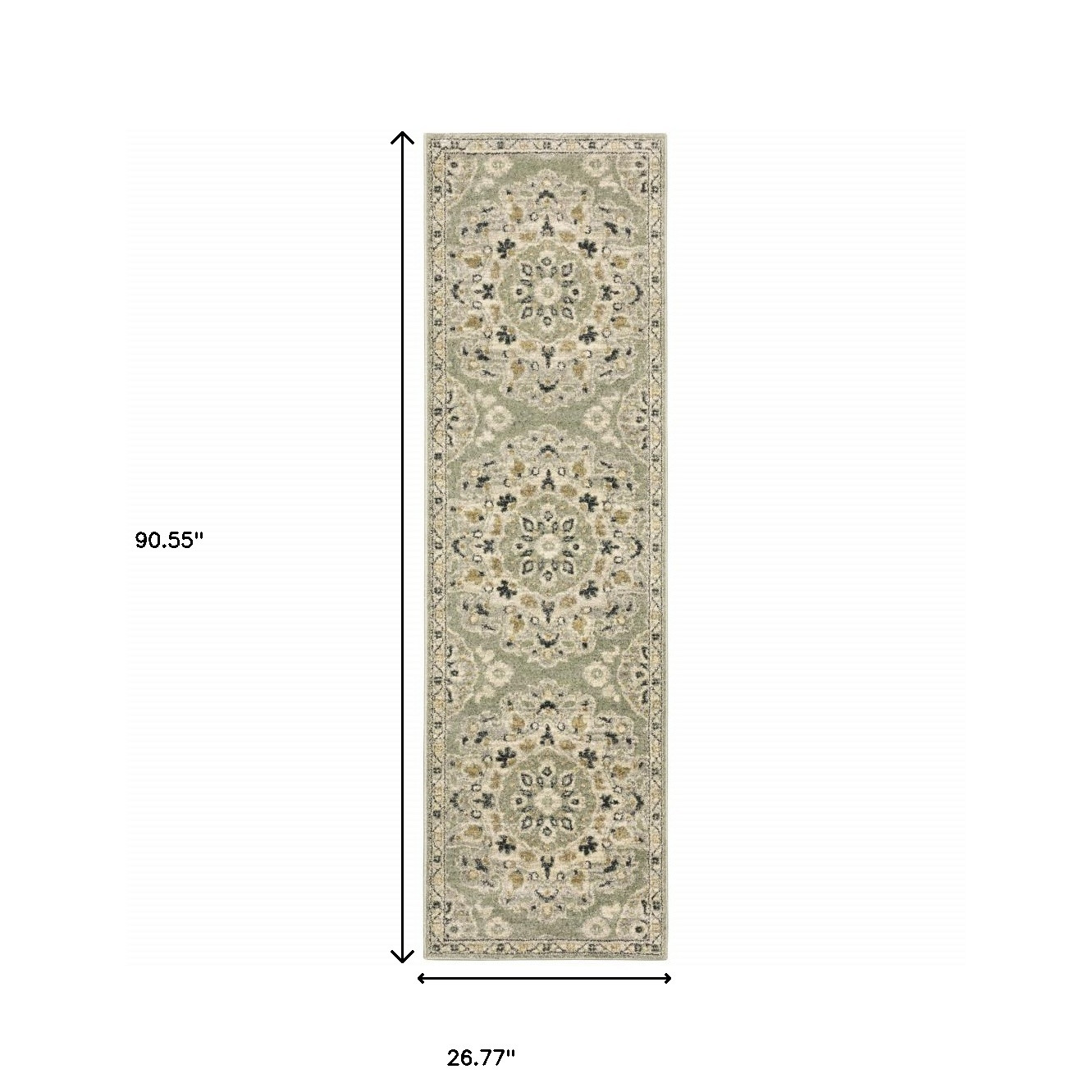 Set an inviting tone in your space with this 2' x 8' green ivory grey and tan floral power loom stain resistant runner rug. This runner shaped rug features a floral design in green ivory grey and tan to give it visual interest. A classic shape marries with good looking design for your space Ideal for spaces with kids and pets, this rug is stain resistant to help repel stains and spilled liquids. Area Rugs help to give warmth and sense of home to your space. 0.47" H x 26.77" W x 90.55" D