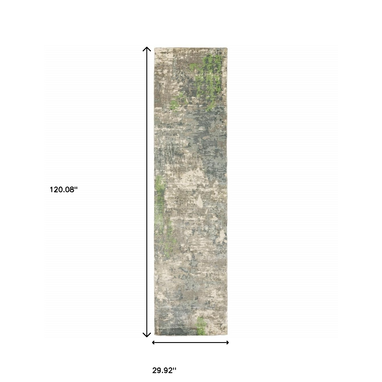 Set an inviting tone in your space with this 2' x 10' blue and green abstract hand loomed stain resistant runner rug. This runner shaped rug features a abstract design in blue and green to give it visual interest. A classic shape marries with good looking design for your space Ideal for spaces with kids and pets, this rug is stain resistant to help repel stains and spilled liquids. Crafted by skilled artisans, this hand loomed rug is genuine and unique. No two will be exactly alike. Place this area rug against a hardwood or tile floor and it will enliven your living space with style and sophistication. 0.19" H x 29.92" W x 120.08" D