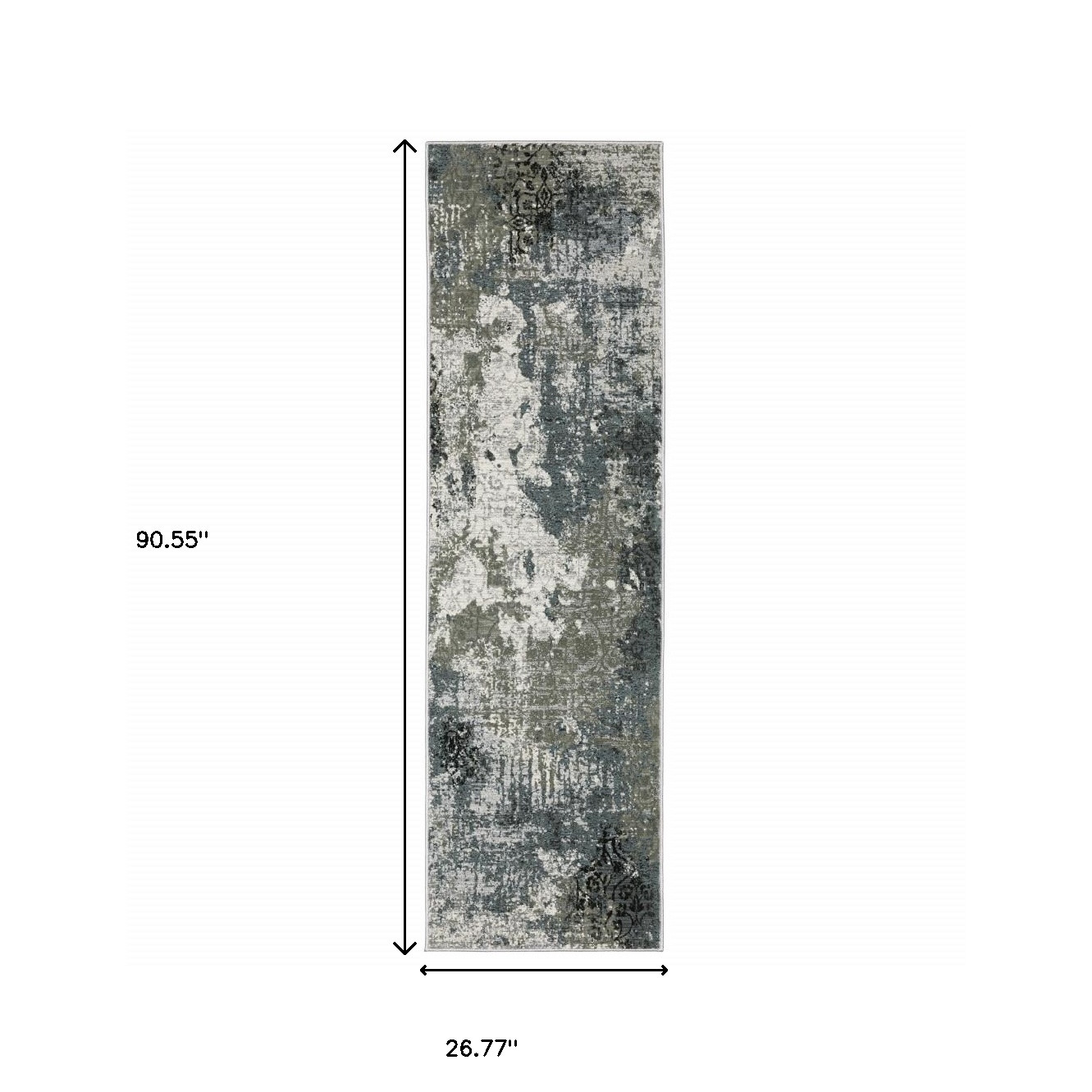 Add great coloration and comfortable texture to your space with this 2' x 8' ivory grey charcoal blue and navy abstract power loom stain resistant runner rug. This runner shaped rug features a abstract design in ivory grey charcoal blue and navy to give it visual interest. A classic shape marries with good looking design for your space Ideal for spaces with kids and pets, this rug is stain resistant to help repel stains and spilled liquids. Area Rugs help to give warmth and sense of home to your space. 1" H x 26.77" W x 90.55" D