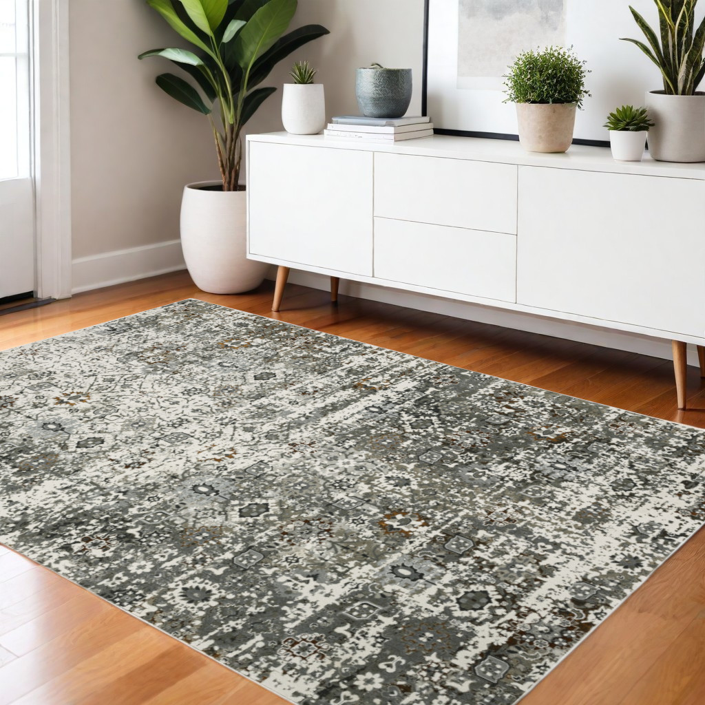 Add some artistry to your room with this 4-foot x 6-foot ivory and gray oriental distressed area rug. Ideal for spaces with kids and pets, this rug is stain resistant to help repel dirt and spilled liquids. Built to last, this rug crafted from polyester fibers is known for its durability and long lasting appeal. Rugs are a great way to showcase your style, hide imperfections, warm your home and reduce noise. 46.06-inch h x 64.96-inch w x 1-inch d.