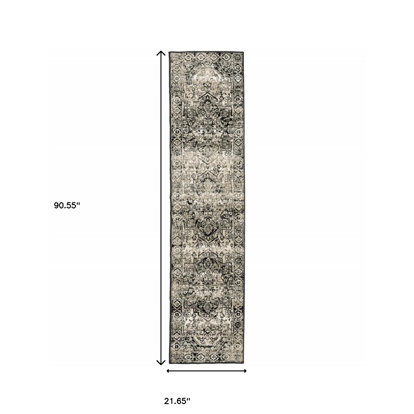 Set an inviting tone in your space with this 2' x 8' black grey tan and ivory oriental power loom stain resistant runner rug. This runner shaped rug features a oriental design in black grey tan and ivory to give it visual interest. A classic shape marries with good looking design for your space Ideal for spaces with kids and pets, this rug is stain resistant to help repel stains and spilled liquids. Place this area rug against a hardwood or tile floor and it will enliven your living space with style and sophistication. 0.39" H x 21.65" W x 90.55" D