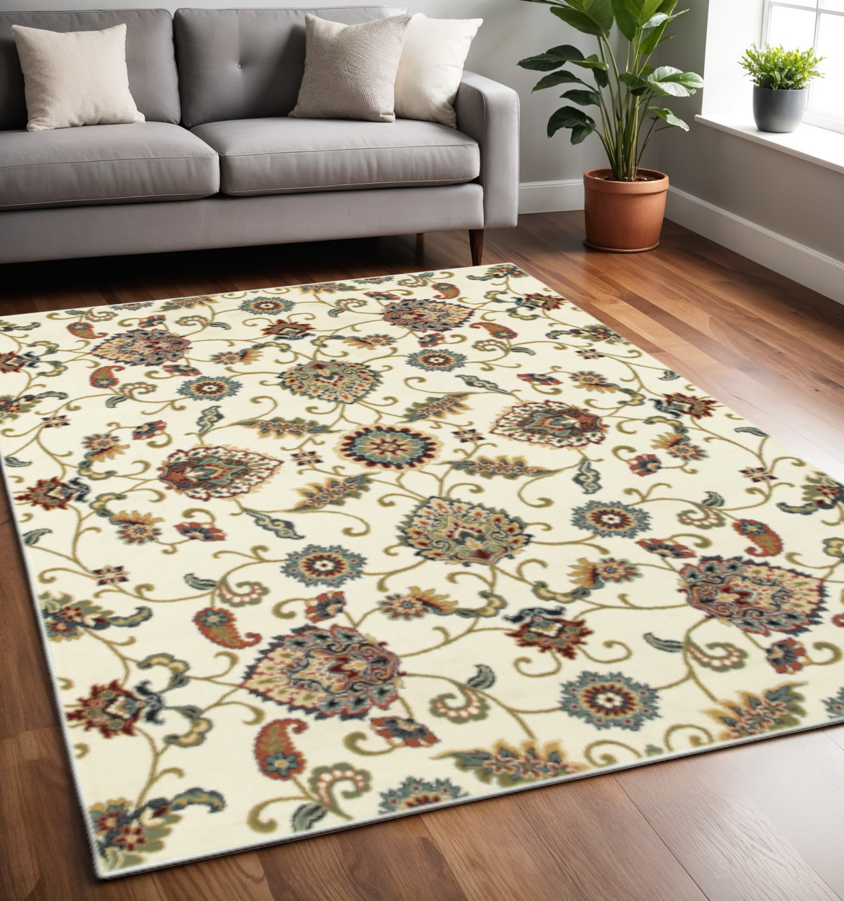 This 5' x 8' ivory green blue red salmon and yellow floral power loom stain resistant area rug, is a great way to add warmth to a room. This rectangle shaped rug features a floral design in ivory green blue red salmon and yellow to give it visual interest. A classic shape marries with good looking design for your space Ideal for spaces with kids and pets, this rug is stain resistant to help repel stains and spilled liquids. Area Rugs help to give warmth and sense of home to your space. 0.31" H x 62.99" W x 90.55" D