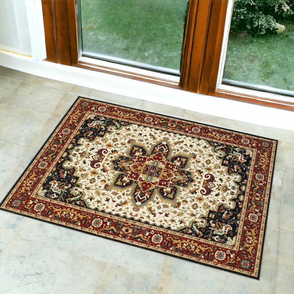 Set an inviting tone in your space with this 2-foot x 3-foot red and ivory oriental area rug. Ideal for spaces with kids and pets, this rug is stain resistant to help repel dirt and spilled liquids. Built to last, this rug crafted from polypropylene fibers is known for its durability and long lasting appeal. Rugs are a great way to showcase your style, hide imperfections, warm your home and reduce noise. 22.44-inch h x 35.83-inch w x 0.31-inch d.