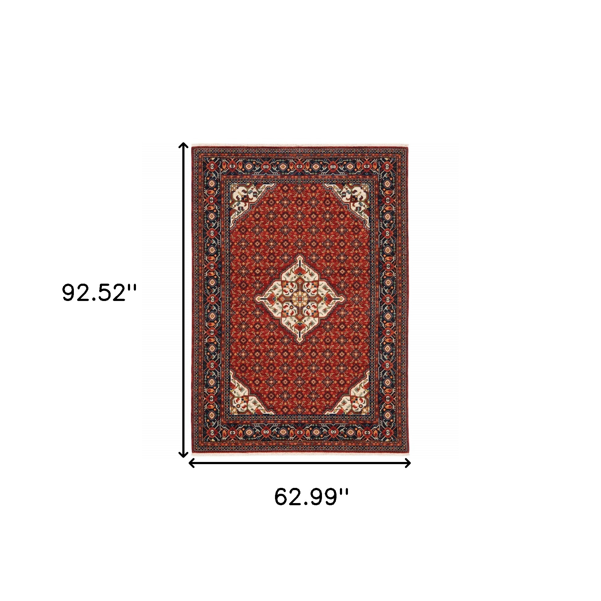 Add some artistry to your room with this 5-foot x 8-foot red blue and black oriental area rug with fringe. Built to last, this rug crafted from wool and nylon fibers is known for its durability and long lasting appeal. Rugs are a great way to showcase your style, hide imperfections, warm your home and reduce noise. Tassel ends bring a timeless and fashionable look to your interior. 62.99-inch h x 92.52-inch w x 0.31-inch d.