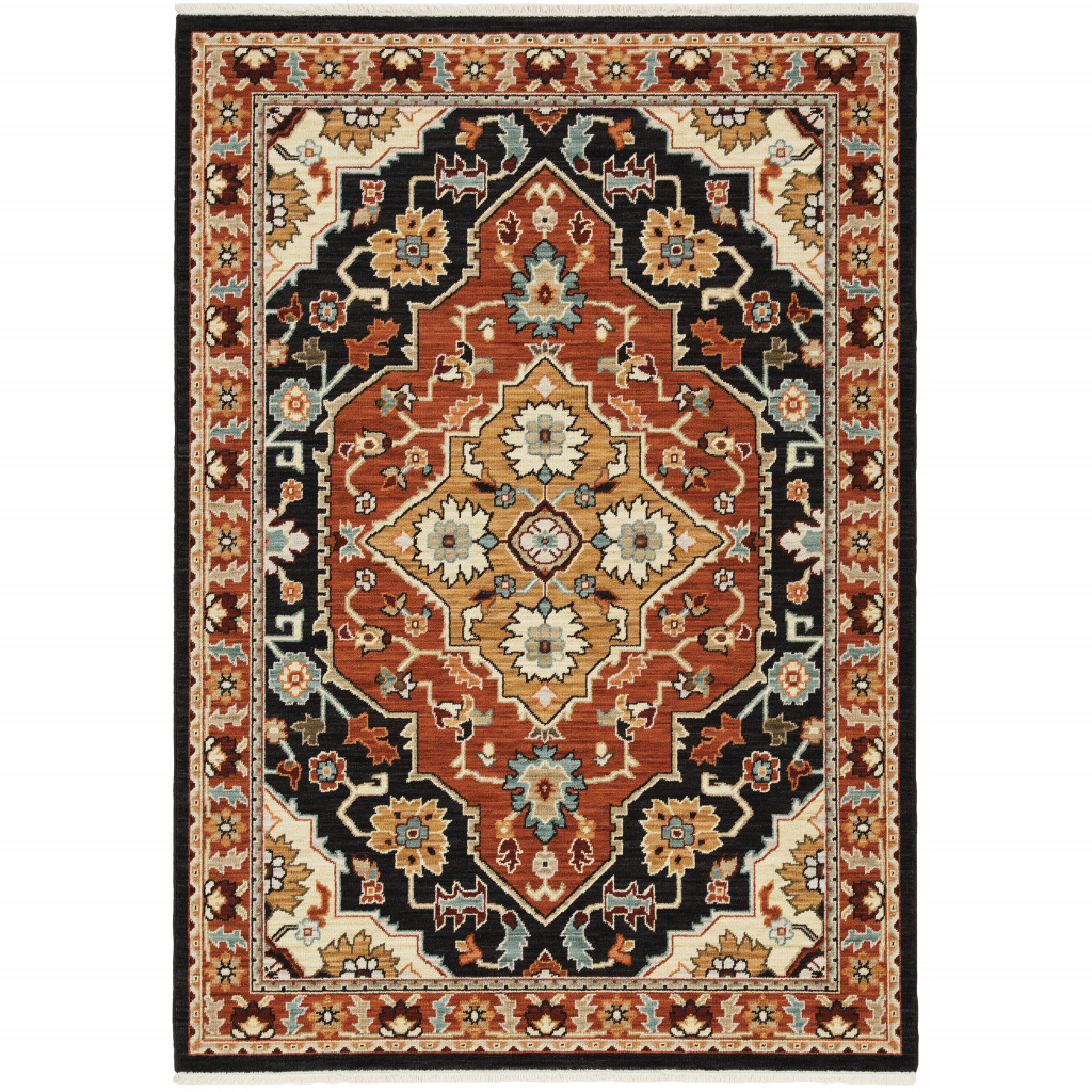 Add some artistry to your room with this 3' x 5' black orange and beige oriental power loom stain resistant area rug with fringe. This rectangle shaped rug features a oriental design in black orange and beige to give it visual interest. A classic shape marries with good looking design for your space Ideal for spaces with kids and pets, this rug is stain resistant to help repel stains and spilled liquids. Tassel ends bring a timeless and fashionable look to your interior. Place this area rug against a hardwood or tile floor and it will enliven your living space with style and sophistication. 0.31" H x 39.37" W x 60.24" D