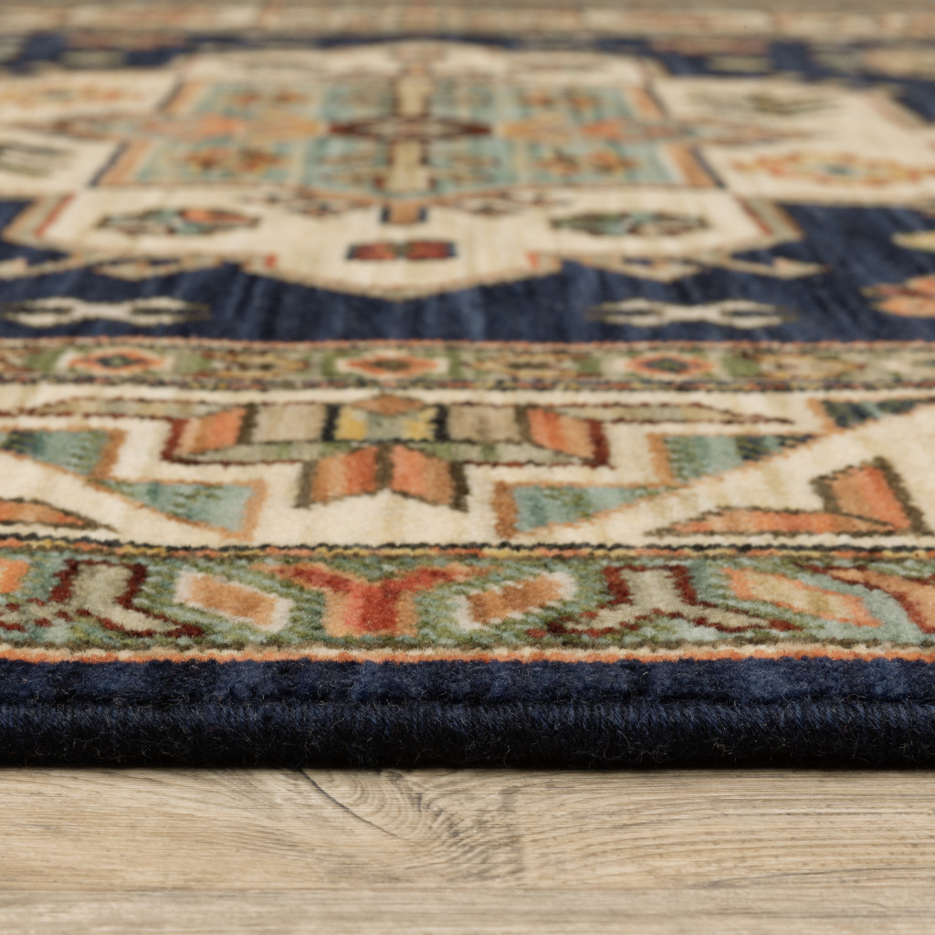Add great coloration and comfortable texture to your space with this 2' x 3' navy charcoal orange rust gold pale blue olive beige and salmon oriental power loom stain resistant area rug with fringe. This rectangle shaped rug features a oriental design in navy charcoal orange rust gold pale blue olive beige and salmon to give it visual interest. A classic shape marries with good looking design for your space Ideal for spaces with kids and pets, this rug is stain resistant to help repel stains and spilled liquids. Tassel ends bring a timeless and fashionable look to your interior. Area Rugs help to give warmth and sense of home to your space. 0.31" H x 23.62" W x 36.22" D