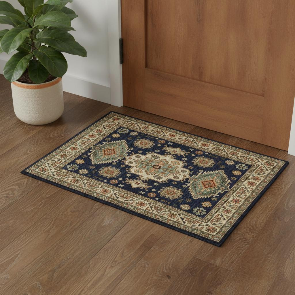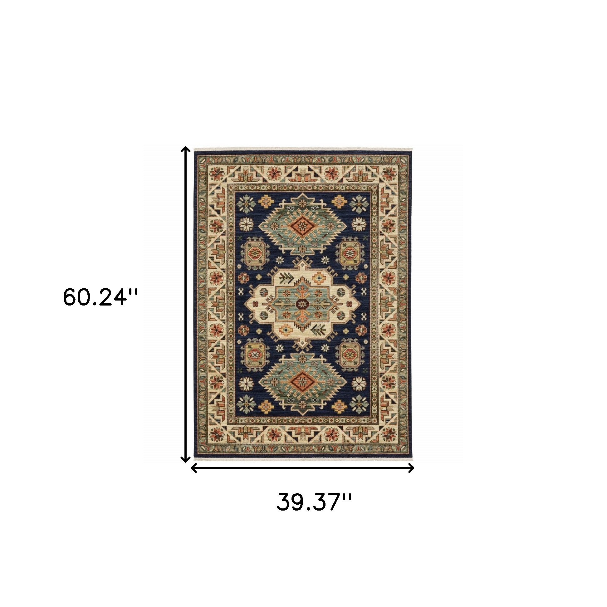 Add some artistry to your room with this 3' x 5' navy charcoal orange rust gold pale blue olive beige and salmon oriental power loom stain resistant area rug with fringe. This rectangle shaped rug features a oriental design in navy charcoal orange rust gold pale blue olive beige and salmon to give it visual interest. A classic shape marries with good looking design for your space Ideal for spaces with kids and pets, this rug is stain resistant to help repel stains and spilled liquids. Tassel ends bring a timeless and fashionable look to your interior. Area Rugs help to give warmth and sense of home to your space. 0.31" H x 39.37" W x 60.24" D