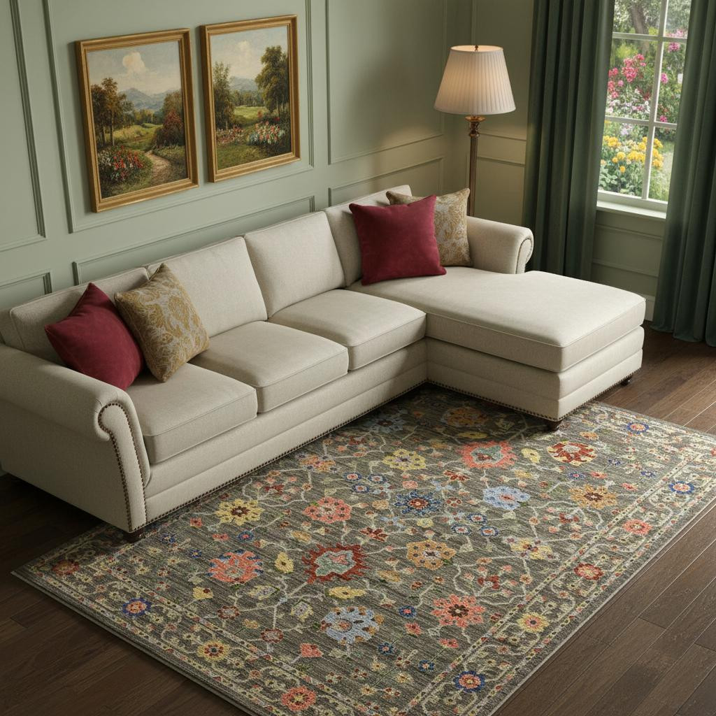 Add some artistry to your room with this 6' x 9' grey salmon pink gold blue rust deep blue ivory and green oriental power loom stain resistant area rug with fringe. This rectangle shaped rug features a oriental design in grey salmon pink gold blue rust deep blue ivory and green to give it visual interest. A classic shape marries with good looking design for your space Ideal for spaces with kids and pets, this rug is stain resistant to help repel stains and spilled liquids. Tassel ends bring a timeless and fashionable look to your interior. Place this area rug against a hardwood or tile floor and it will enliven your living space with style and sophistication. 0.31" H x 78.74" W x 116.54" D