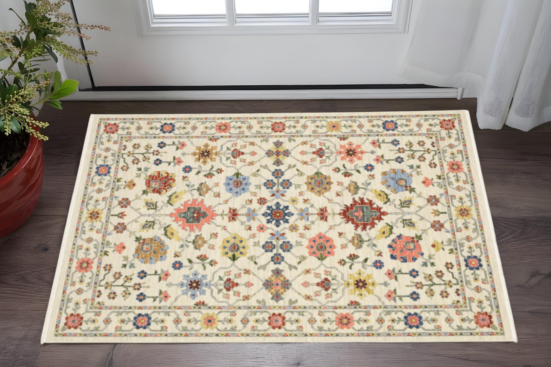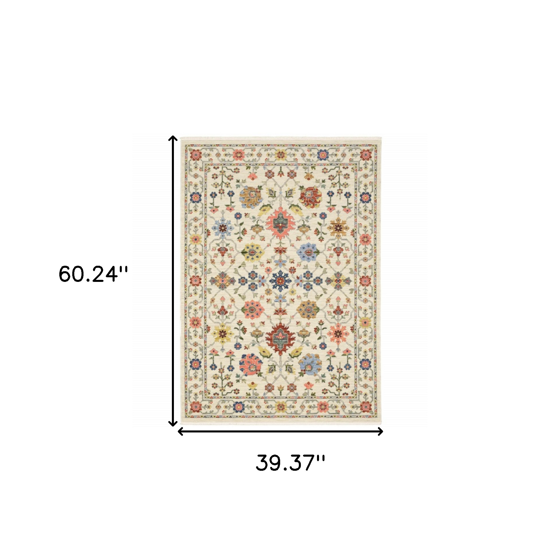 This 3' x 5' ivory salmon pink gold blues grey rust and green oriental power loom stain resistant area rug with fringe, is a great way to add warmth to a room. This rectangle shaped rug features a oriental design in ivory salmon pink gold blues grey rust and green to give it visual interest. A classic shape marries with good looking design for your space Ideal for spaces with kids and pets, this rug is stain resistant to help repel stains and spilled liquids. Tassel ends bring a timeless and fashionable look to your interior. Area Rugs help to give warmth and sense of home to your space. 0.31" H x 39.37" W x 60.24" D
