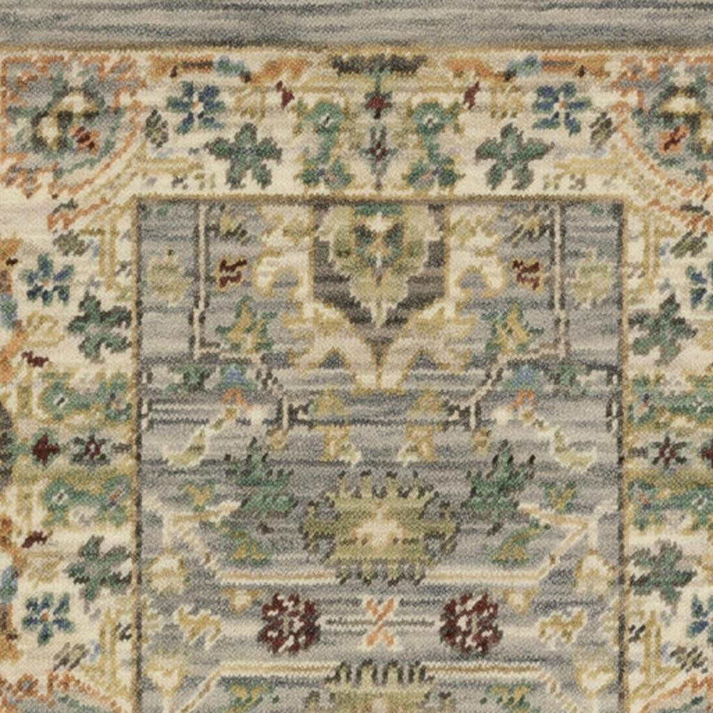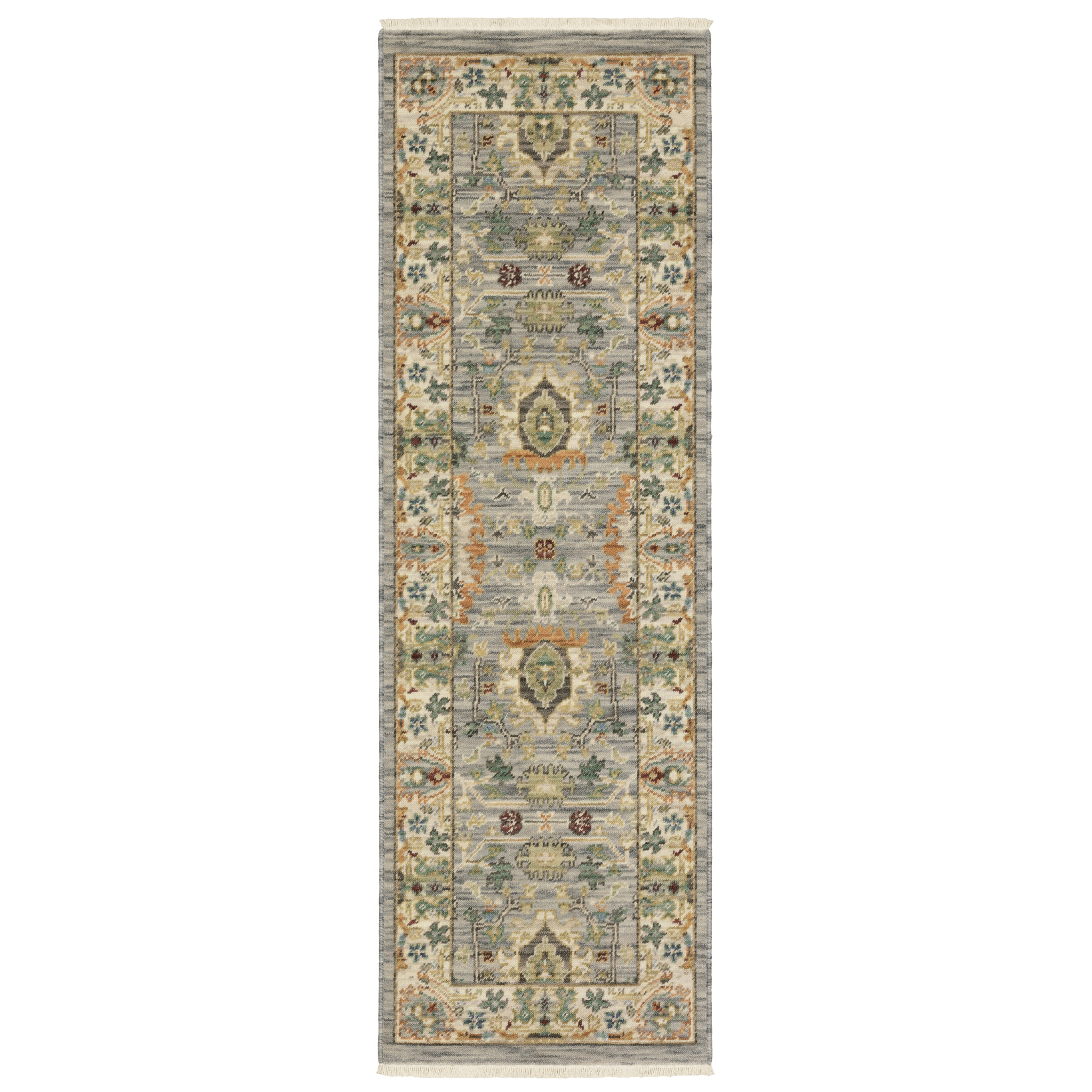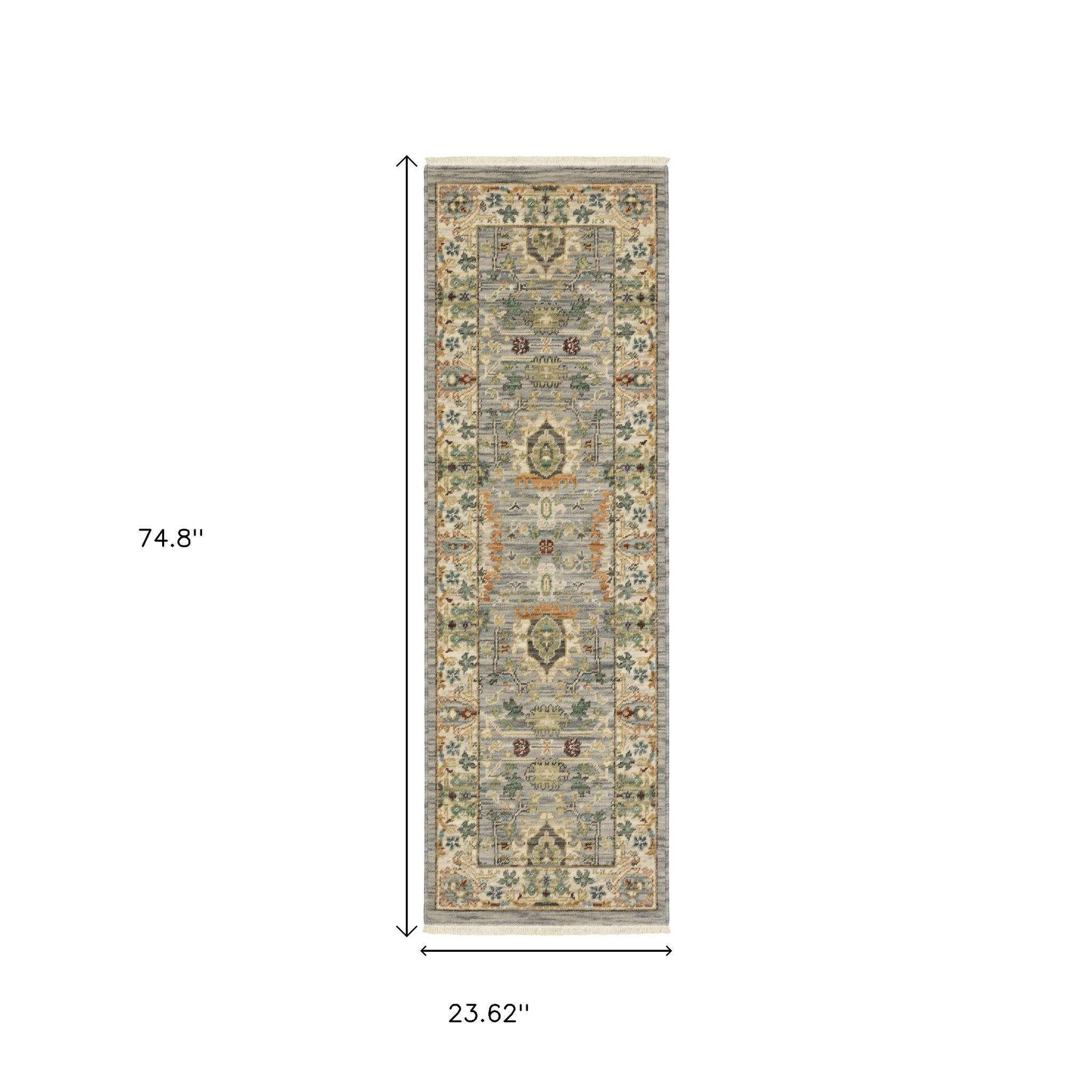 Set an inviting tone in your space with this 2' x 6' grey ivory orange teal green charcoal blue and red oriental power loom stain resistant runner rug with fringe. This runner shaped rug features a oriental design in grey ivory orange teal green charcoal blue and red to give it visual interest. A classic shape marries with good looking design for your space Ideal for spaces with kids and pets, this rug is stain resistant to help repel stains and spilled liquids. Tassel ends bring a timeless and fashionable look to your interior. Area Rugs help to give warmth and sense of home to your space. 0.31" H x 23.62" W x 74.8" D