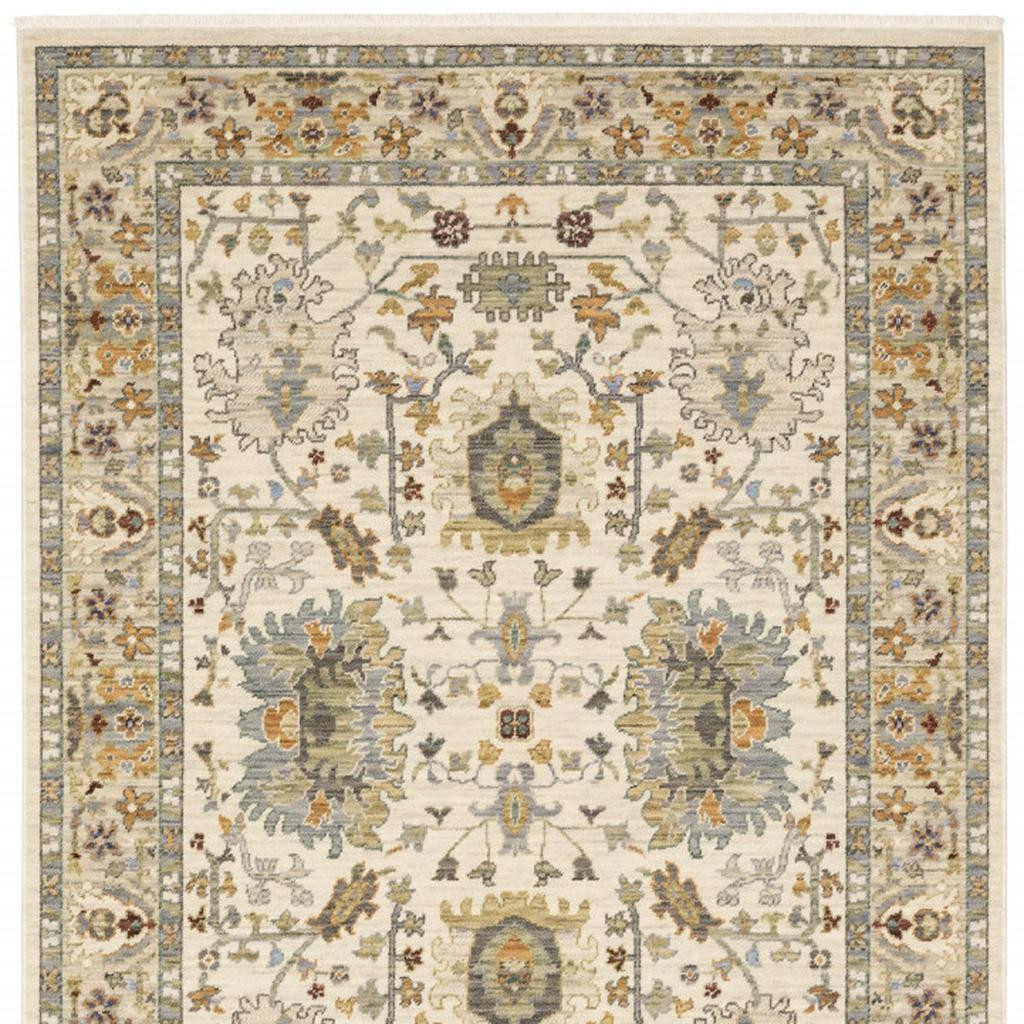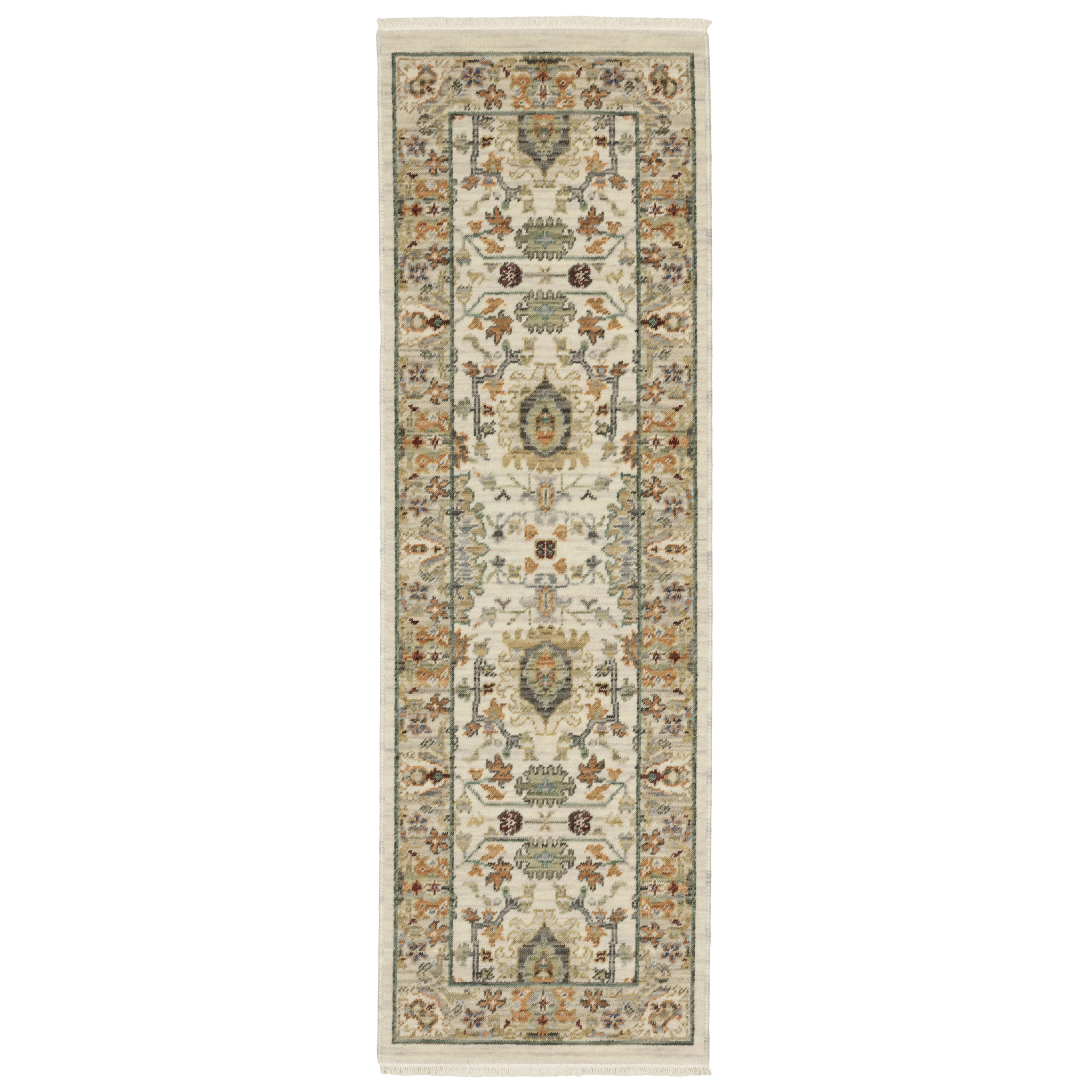 Add some artistry to your room with this 2' x 6' ivory grey orange green blue and red oriental power loom stain resistant runner rug with fringe. This runner shaped rug features a oriental design in ivory grey orange green blue and red to give it visual interest. A classic shape marries with good looking design for your space Ideal for spaces with kids and pets, this rug is stain resistant to help repel stains and spilled liquids. Tassel ends bring a timeless and fashionable look to your interior. Place this area rug against a hardwood or tile floor and it will enliven your living space with style and sophistication. 0.31" H x 23.62" W x 74.8" D