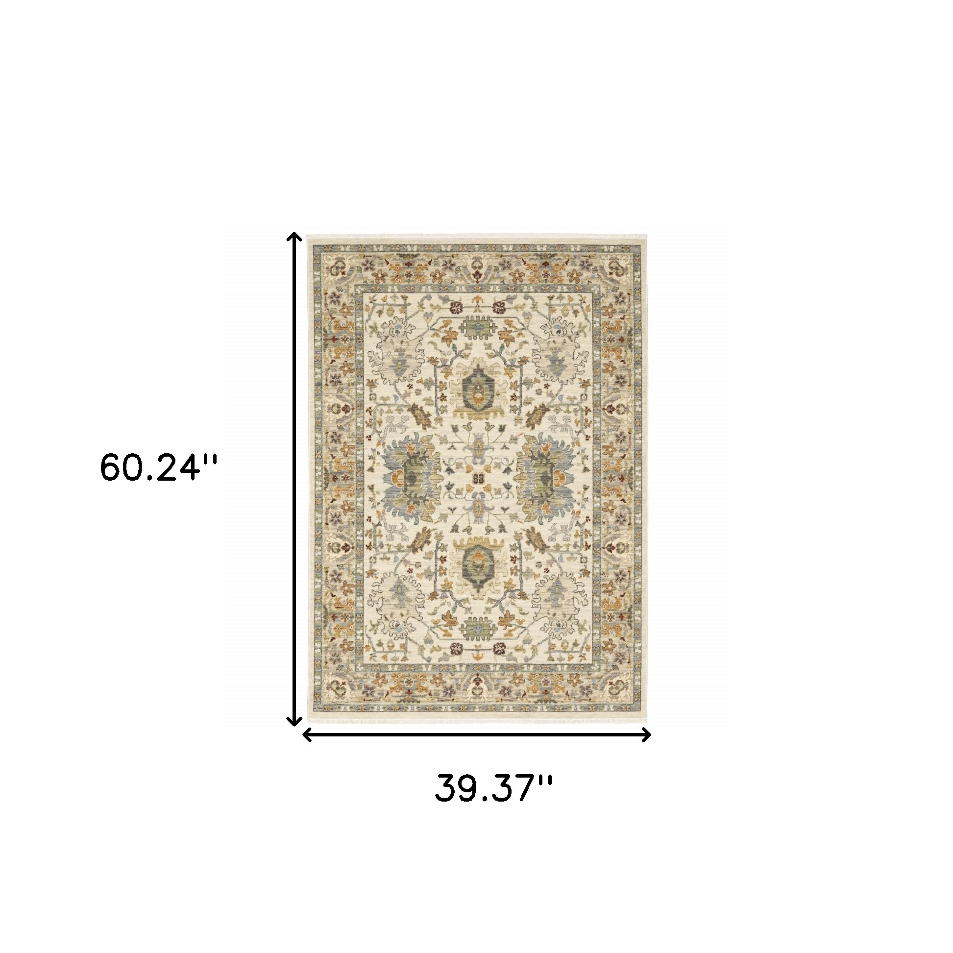 Add great coloration and comfortable texture to your space with this 3' x 5' ivory grey orange green blue and red oriental power loom stain resistant area rug with fringe. This rectangle shaped rug features a oriental design in ivory grey orange green blue and red to give it visual interest. A classic shape marries with good looking design for your space Ideal for spaces with kids and pets, this rug is stain resistant to help repel stains and spilled liquids. Tassel ends bring a timeless and fashionable look to your interior. Area Rugs help to give warmth and sense of home to your space. 0.31" H x 39.37" W x 60.24" D