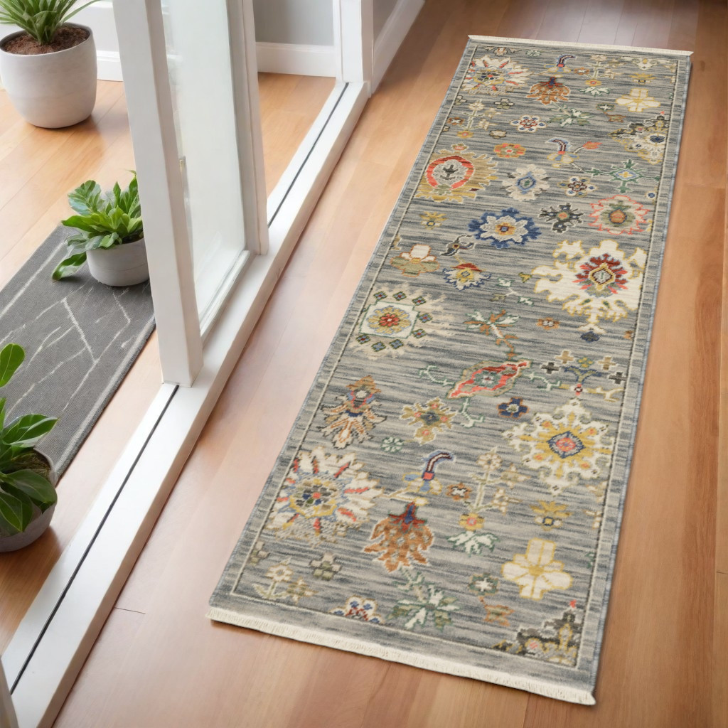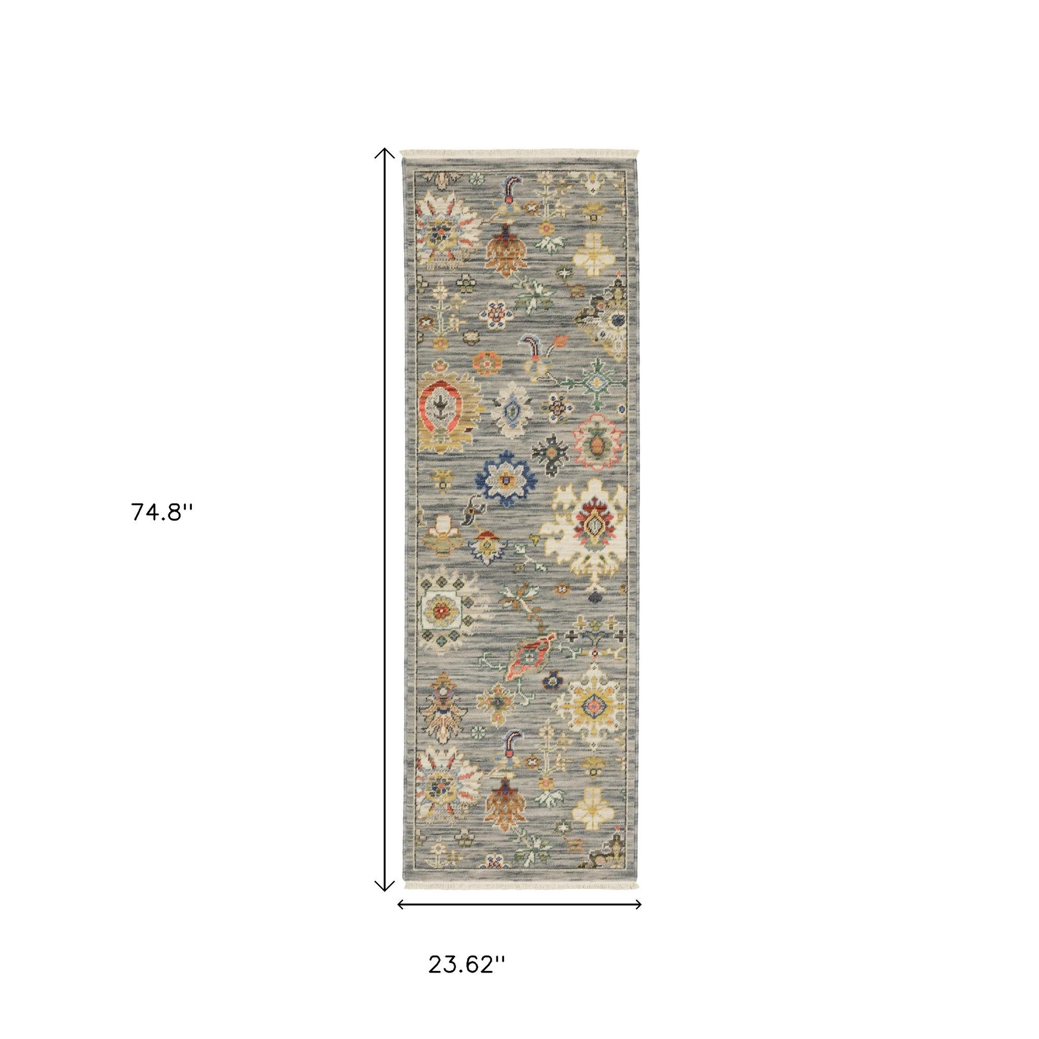 Add some artistry to your room with this 2' x 6' grey ivory gold salmon red blue and green oriental power loom stain resistant runner rug with fringe. This runner shaped rug features a oriental design in grey ivory gold salmon red blue and green to give it visual interest. A classic shape marries with good looking design for your space Ideal for spaces with kids and pets, this rug is stain resistant to help repel stains and spilled liquids. Tassel ends bring a timeless and fashionable look to your interior. Place this area rug against a hardwood or tile floor and it will enliven your living space with style and sophistication. 0.31" H x 23.62" W x 74.8" D