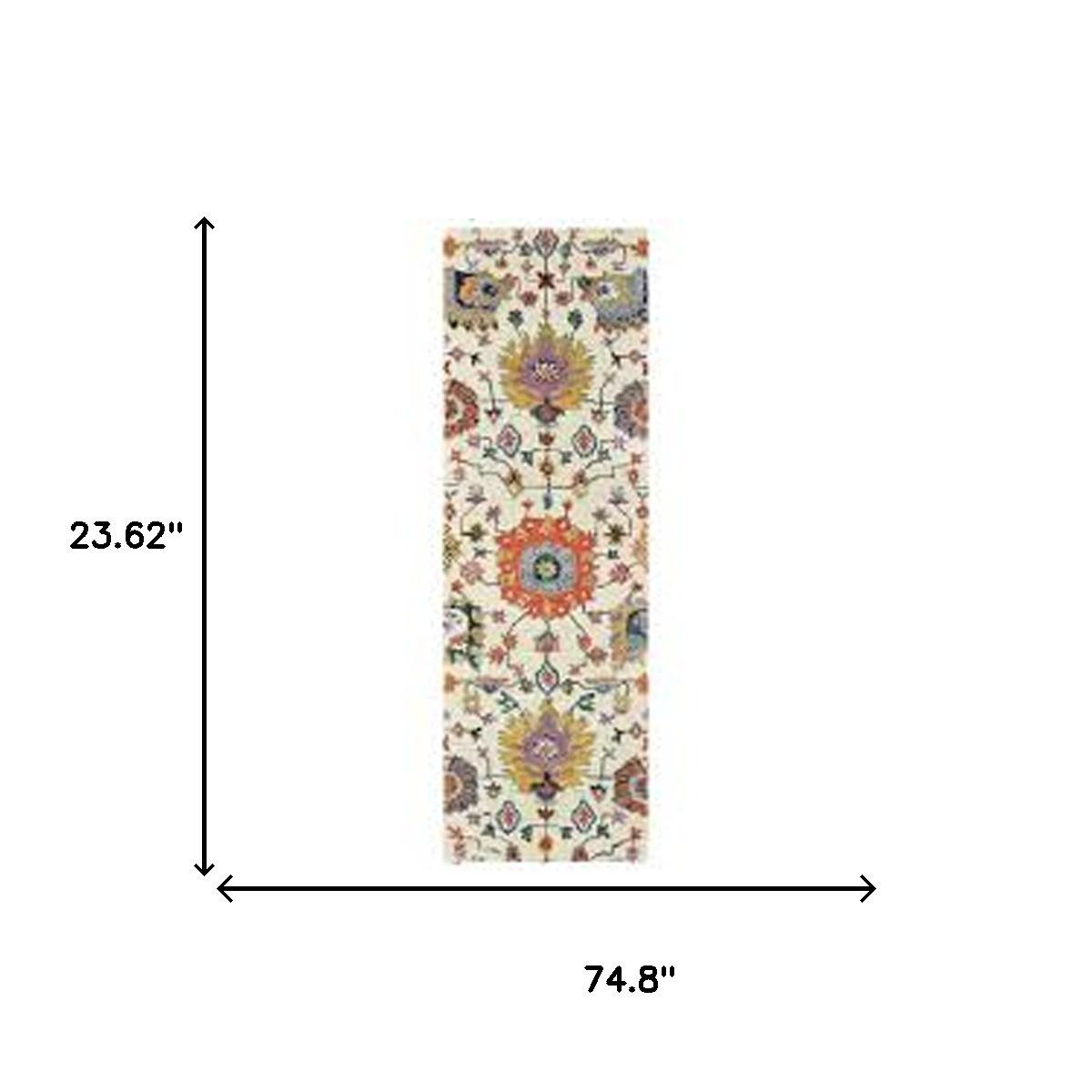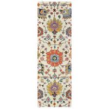Set an inviting tone in your space with this 2' x 6' ivory yellow rust green grey pink orange blue and grey oriental power loom stain resistant runner rug with fringe. This runner shaped rug features a oriental design in ivory yellow rust green grey pink orange blue and grey to give it visual interest. A classic shape marries with good looking design for your space Ideal for spaces with kids and pets, this rug is stain resistant to help repel stains and spilled liquids. Tassel ends bring a timeless and fashionable look to your interior. Place this area rug against a hardwood or tile floor and it will enliven your living space with style and sophistication. 0.31" H x 23.62" W x 74.8" D
