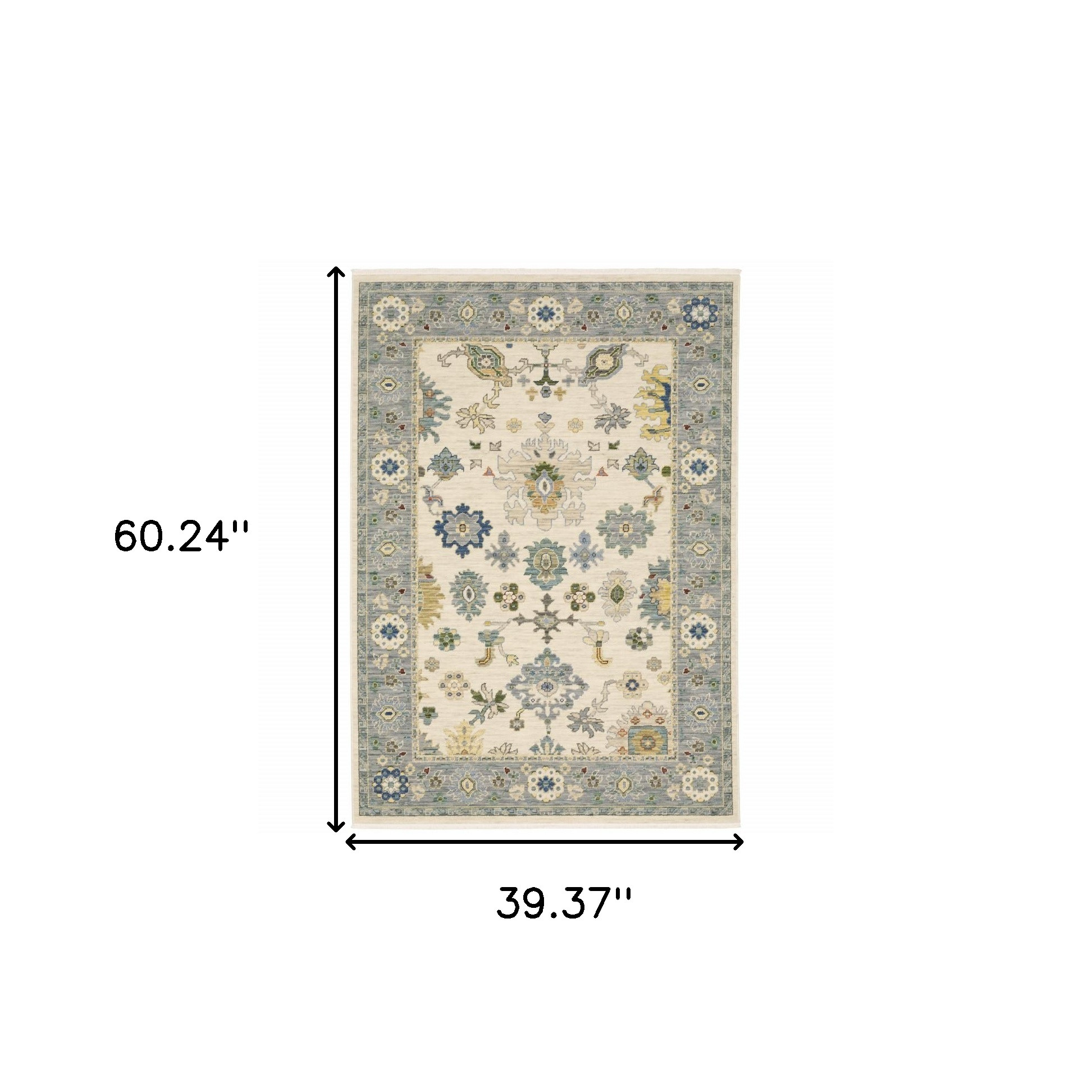 This 3' x 5' ivory blue grey teal gold green and rust oriental power loom stain resistant area rug with fringe, is a great way to add warmth to a room. This rectangle shaped rug features a oriental design in ivory blue grey teal gold green and rust to give it visual interest. A classic shape marries with good looking design for your space Ideal for spaces with kids and pets, this rug is stain resistant to help repel stains and spilled liquids. Tassel ends bring a timeless and fashionable look to your interior. Area Rugs help to give warmth and sense of home to your space. 0.31" H x 39.37" W x 60.24" D