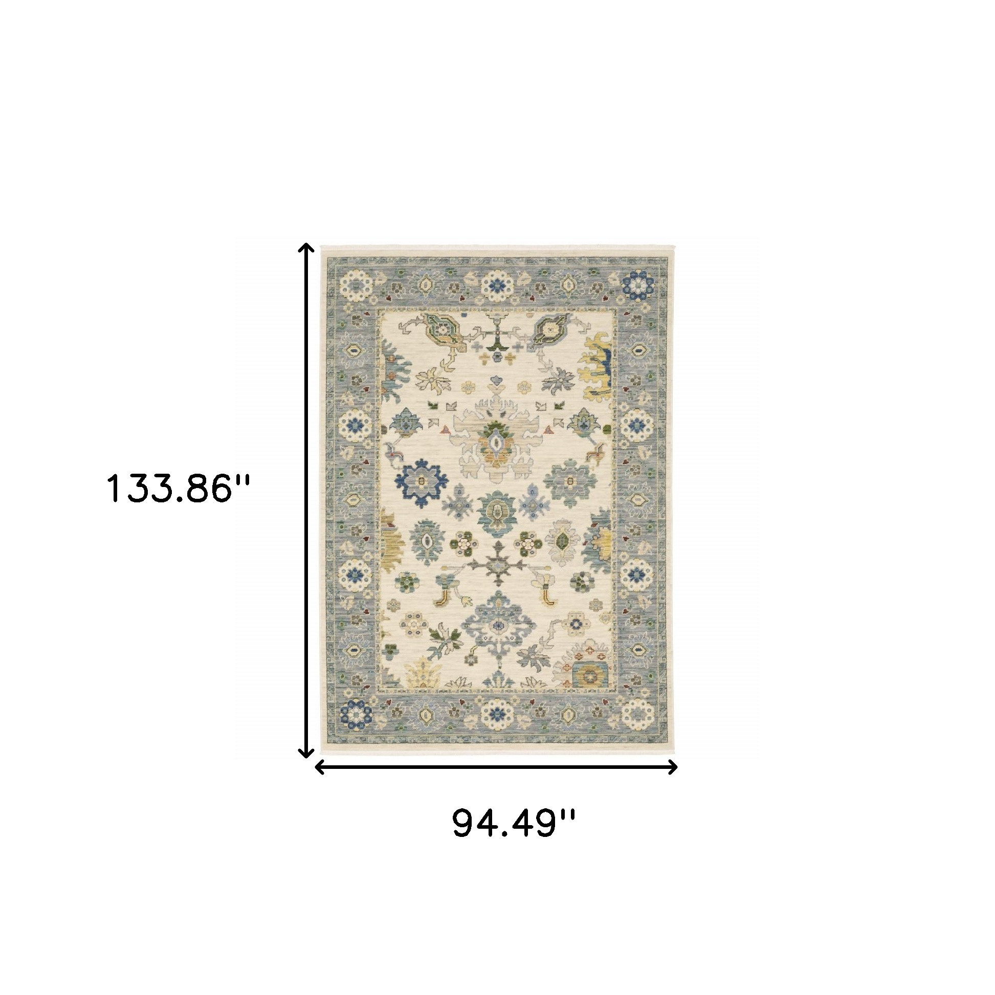 Add great coloration and comfortable texture to your space with this 8' x 11' ivory blue grey teal gold green and rust oriental power loom stain resistant area rug with fringe. This rectangle shaped rug features a oriental design in ivory blue grey teal gold green and rust to give it visual interest. A classic shape marries with good looking design for your space Ideal for spaces with kids and pets, this rug is stain resistant to help repel stains and spilled liquids. Tassel ends bring a timeless and fashionable look to your interior. Area Rugs help to give warmth and sense of home to your space. 0.31" H x 94.49" W x 133.86" D