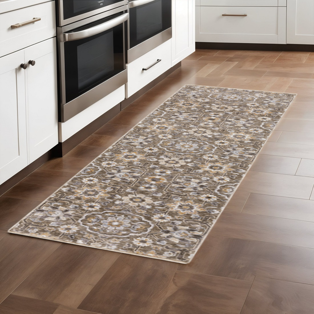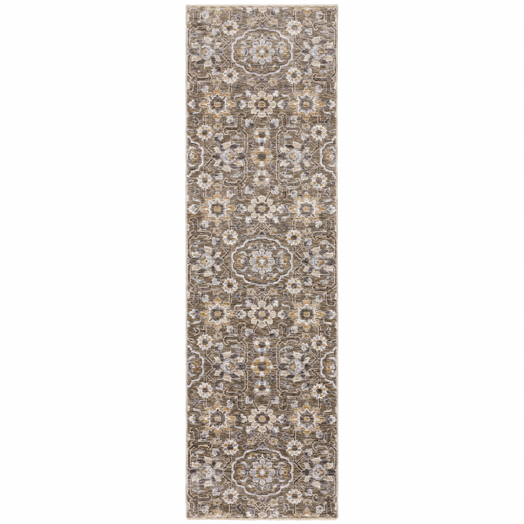 Add great coloration and comfortable texture to your space with this 2' x 8' grey and tan floral power loom stain resistant runner rug with fringe. This runner shaped rug features a floral design in grey and tan to give it visual interest. A classic shape marries with good looking design for your space Ideal for spaces with kids and pets, this rug is stain resistant to help repel stains and spilled liquids. Tassel ends bring a timeless and fashionable look to your interior. Place this area rug against a hardwood or tile floor and it will enliven your living space with style and sophistication. 0.23" H x 26.77" W x 92.52" D