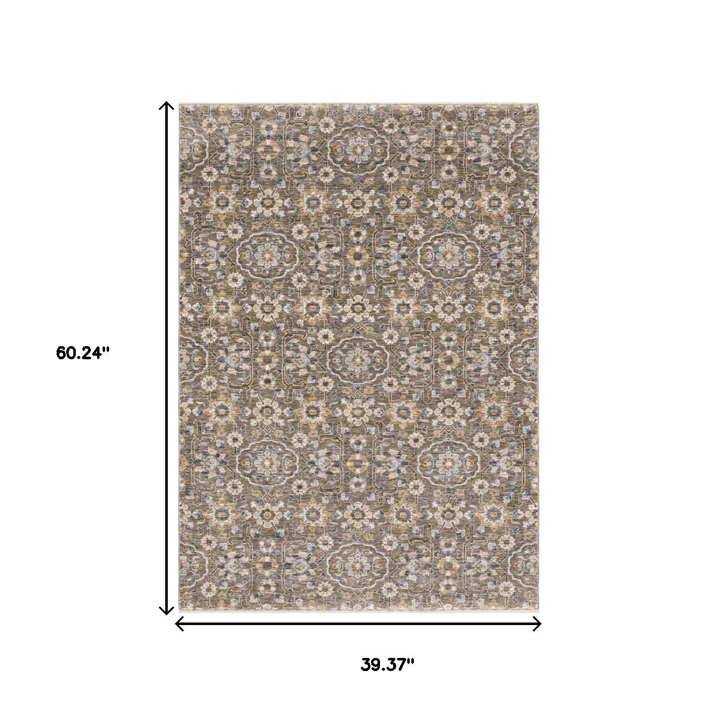 Set an inviting tone in your space with this 3' x 5' grey and tan floral power loom stain resistant area rug with fringe. This rectangle shaped rug features a floral design in grey and tan to give it visual interest. A classic shape marries with good looking design for your space Ideal for spaces with kids and pets, this rug is stain resistant to help repel stains and spilled liquids. Tassel ends bring a timeless and fashionable look to your interior. Area Rugs help to give warmth and sense of home to your space. 0.23" H x 39.37" W x 60.24" D