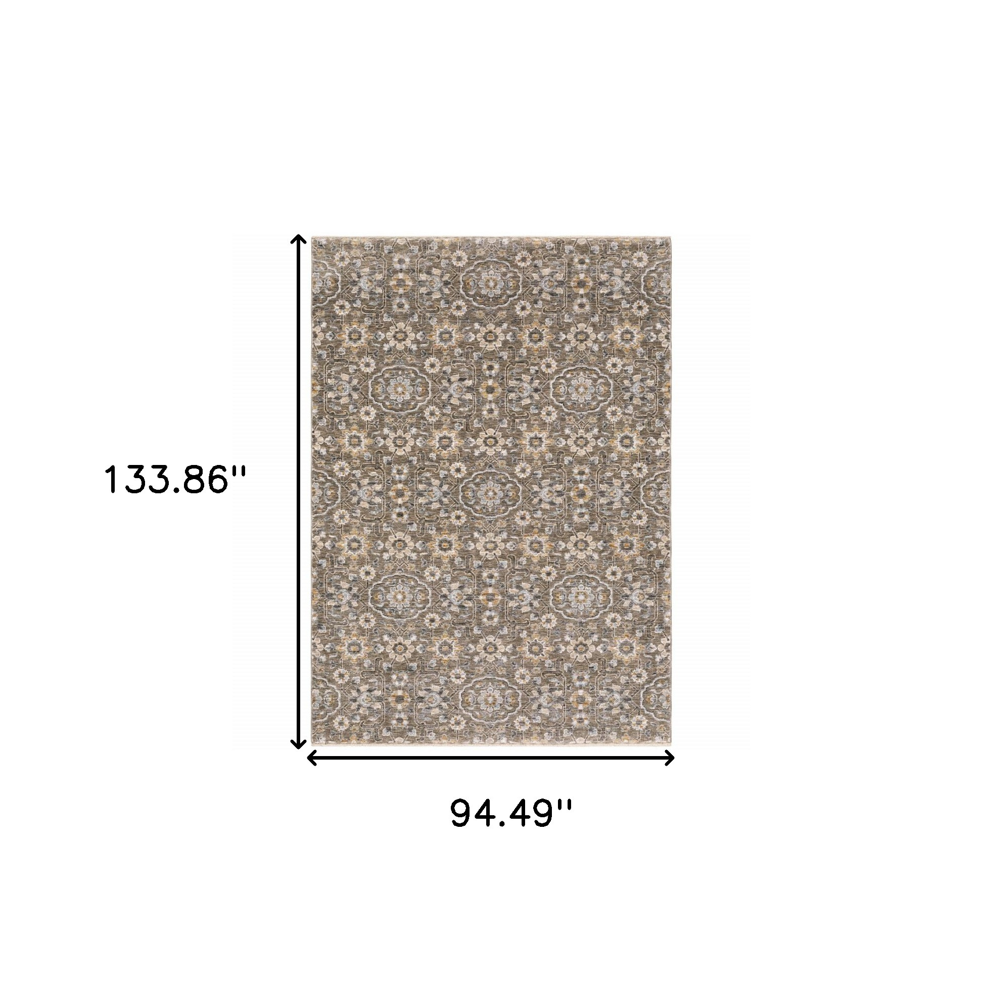 Set an inviting tone in your space with this 8-foot x 11-foot gray floral power loom area rug with fringe. This rectangle shaped rug features a floral design in gray to give it visual interest. A classic shape marries with good looking design for your space the coloring of this rug adds a delightfully neutral tone to your home and will easily match with most any decor. Ideal for spaces with kids and pets, this rug is stain resistant to help repel stains and spilled liquids. Tassel ends bring a timeless and fashionable look to your interior. 94.49-inch H x 133.86-inch W x 0.23-inch D