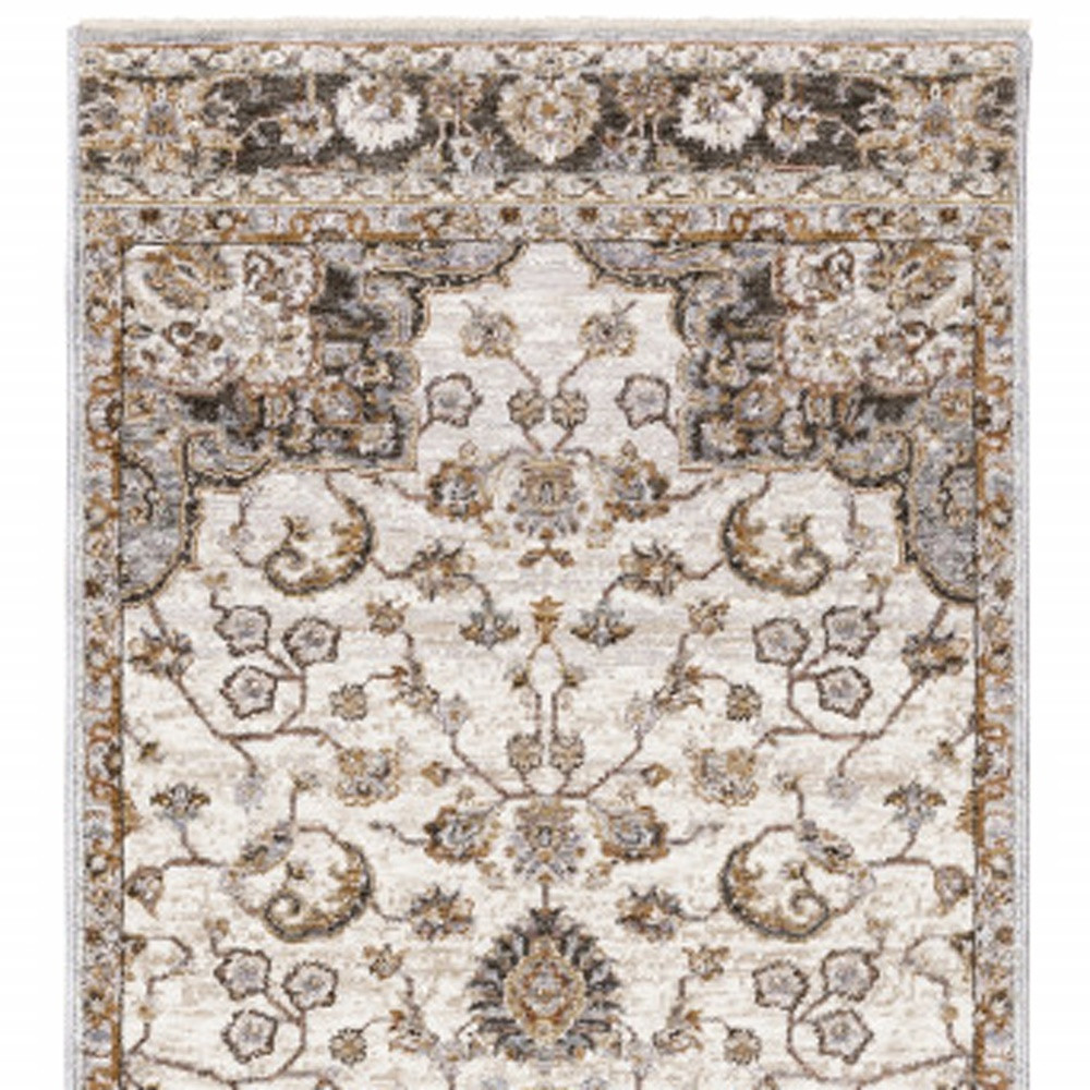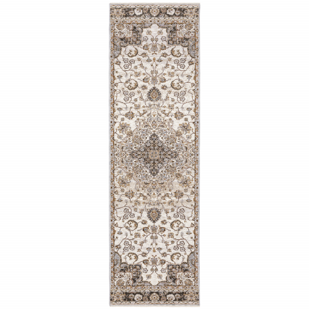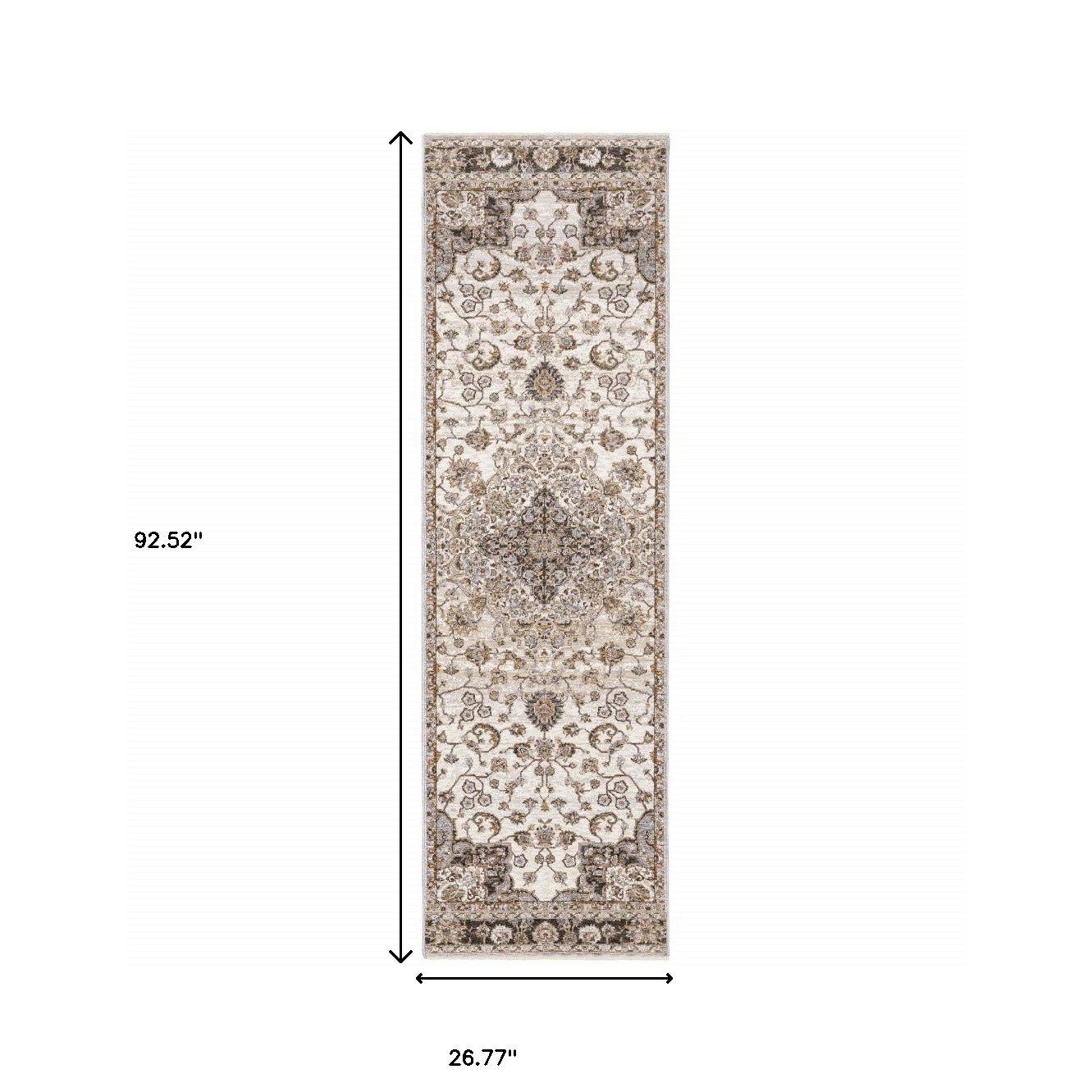 Set an inviting tone in your space with this 2' x 8' ivory and blue oriental power loom stain resistant runner rug with fringe. This runner shaped rug features a oriental design in ivory and blue to give it visual interest. A classic shape marries with good looking design for your space Ideal for spaces with kids and pets, this rug is stain resistant to help repel stains and spilled liquids. Tassel ends bring a timeless and fashionable look to your interior. Area Rugs help to give warmth and sense of home to your space. 0.23" H x 26.77" W x 92.52" D