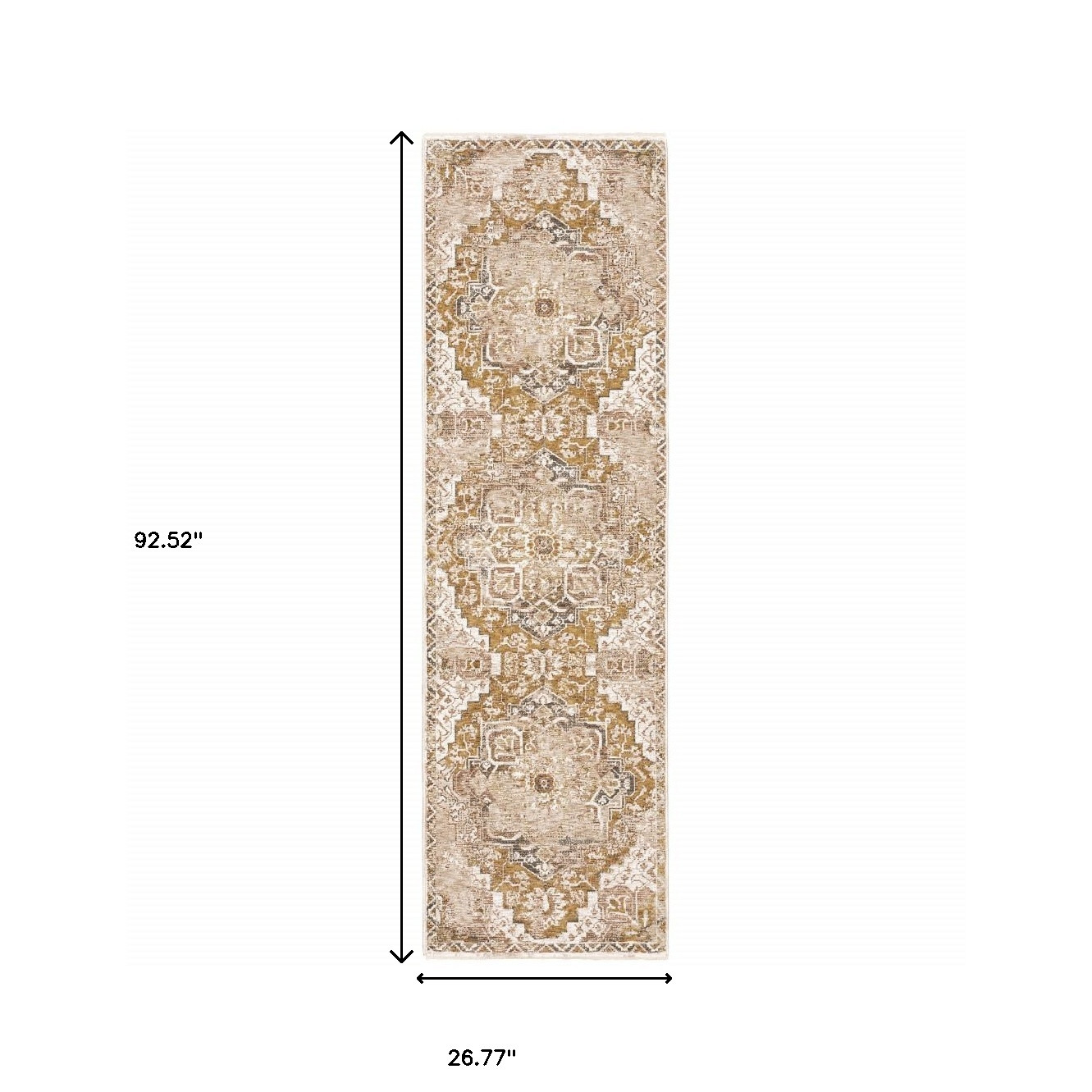 This 2-foot x 8-foot gold and ivory oriental power loom stain resistant runner rug with fringe, is a great way to add warmth to a room. This runner shaped rug features a oriental design that will add a functional and decorative accent to your space. Ideal for spaces with kids and pets, this rug is stain resistant to help repel dirt and spilled liquids. Tassel ends bring a timeless and fashionable look to your interior. This smaller sized rug is just what you need for your walkway, or in front of door, cabinet, refrigerator, or chair. 26.77-inch h x 92.52-inch w x 0.23-inch d