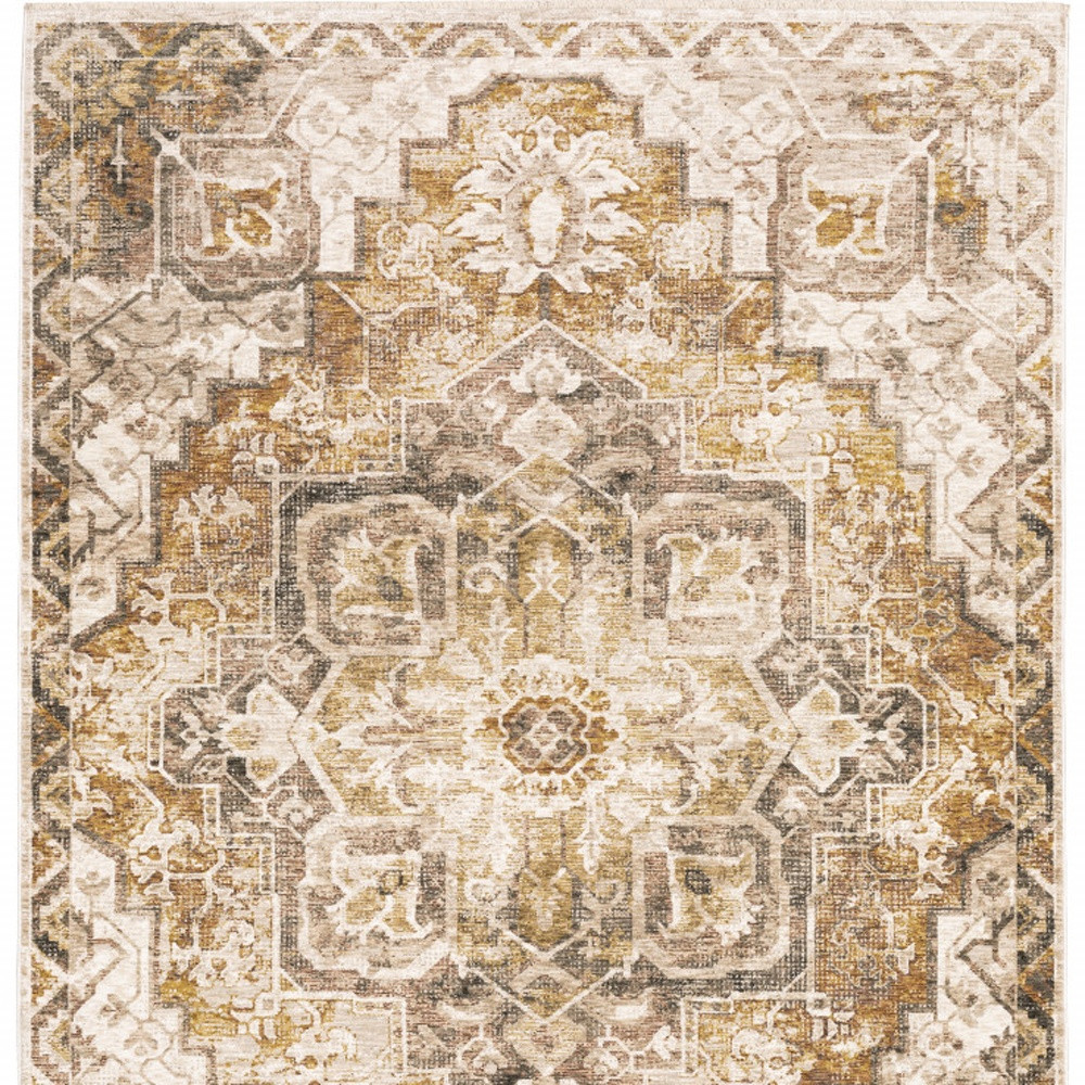 Set an inviting tone in your space with this 2-foot x 3-foot gold and brown oriental distressed area rug with fringe. Ideal for spaces with kids and pets, this rug is stain resistant to help repel dirt and spilled liquids. Built to last, this rug crafted from polyester fibers is known for its durability and long lasting appeal. Rugs are a great way to showcase your style, hide imperfections, warm your home and reduce noise. Tassel ends bring a timeless and fashionable look to your interior. This smaller sized, traditional styled rug is just what you need for your walkway, bedside, in front of door, cabinet, refrigerator, or chair. 23.62-inch h x 36.22-inch w x 0.23-inch d.
