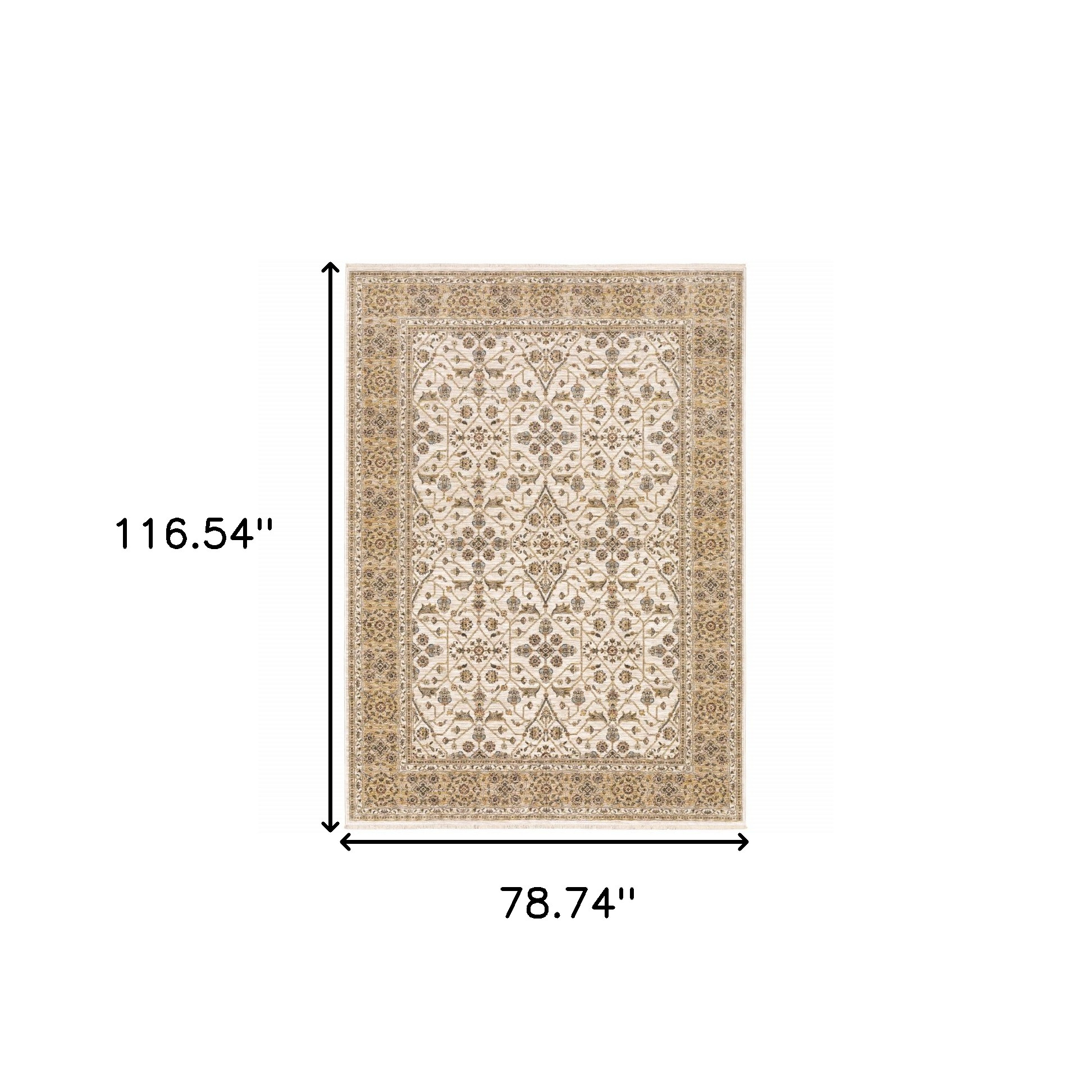 Add great coloration and comfortable texture to your space with this 7-foot x 10-foot ivory and gold oriental area rug with fringe. Ideal for spaces with kids and pets, this rug is stain resistant to help repel dirt and spilled liquids. Built to last, this rug crafted from polyester fibers is known for its durability and long lasting appeal. Rugs are a great way to showcase your style, hide imperfections, warm your home and reduce noise. Tassel ends bring a timeless and fashionable look to your interior. 78.74-inch h x 116.54-inch w x 0.23-inch d.
