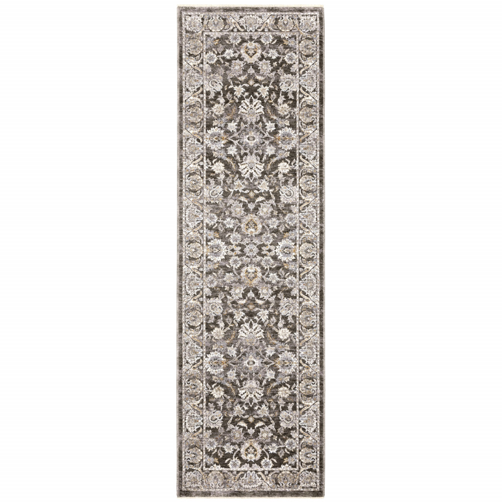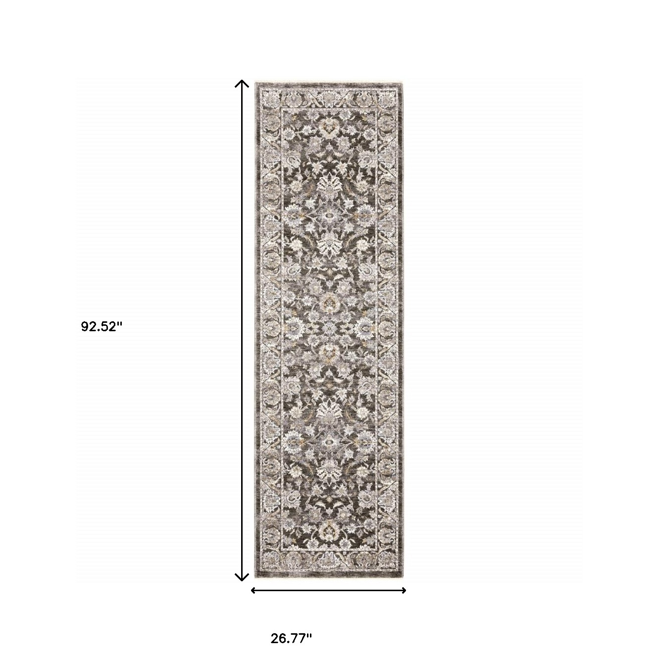 This 2' x 8' grey and ivory oriental power loom stain resistant runner rug with fringe, is a great way to add warmth to a room. This runner shaped rug features a oriental design in grey and ivory to give it visual interest. A classic shape marries with good looking design for your space Ideal for spaces with kids and pets, this rug is stain resistant to help repel stains and spilled liquids. Tassel ends bring a timeless and fashionable look to your interior. Area Rugs help to give warmth and sense of home to your space. 0.23" H x 26.77" W x 92.52" D