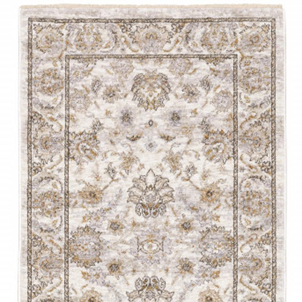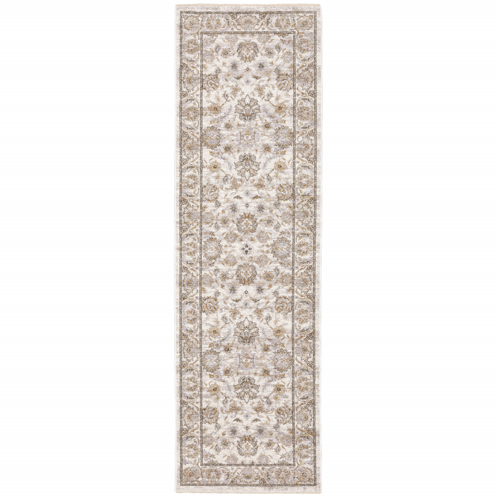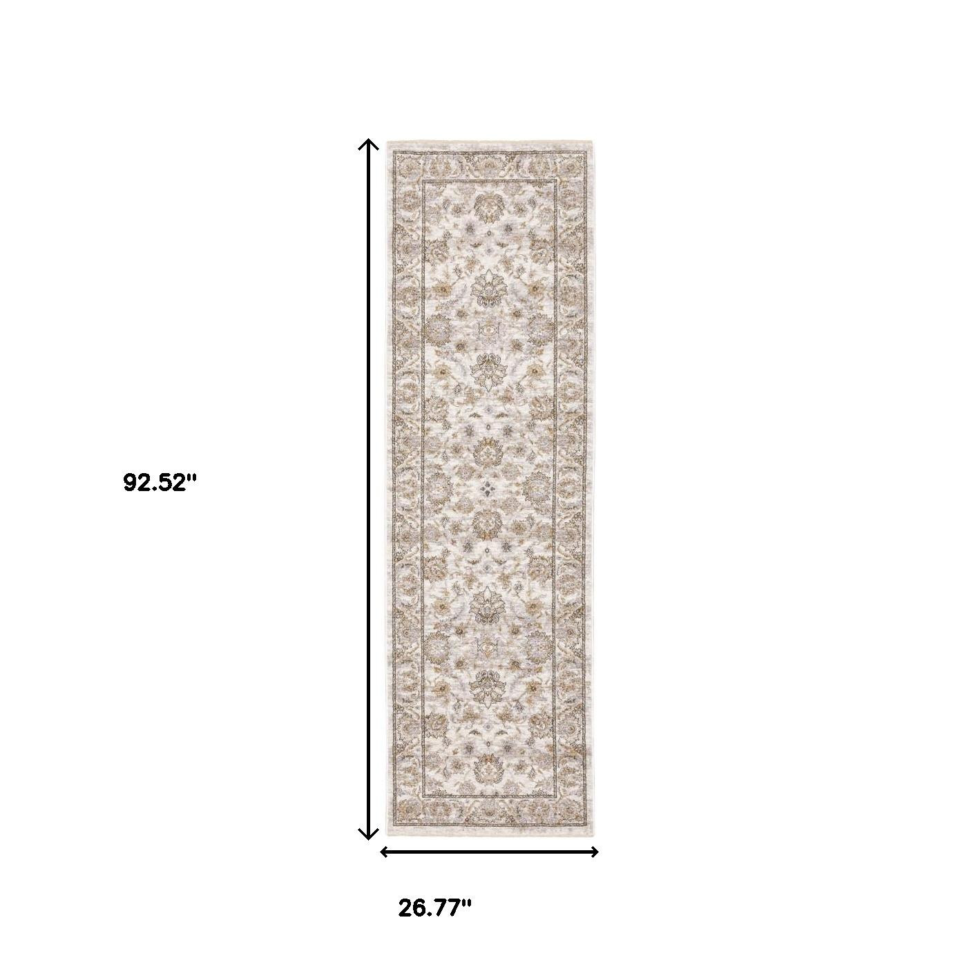 Set an inviting tone in your space with this 2' x 8' ivory and grey oriental power loom stain resistant runner rug with fringe. This runner shaped rug features a oriental design in ivory and grey to give it visual interest. A classic shape marries with good looking design for your space Ideal for spaces with kids and pets, this rug is stain resistant to help repel stains and spilled liquids. Tassel ends bring a timeless and fashionable look to your interior. Area Rugs help to give warmth and sense of home to your space. 0.23" H x 26.77" W x 92.52" D