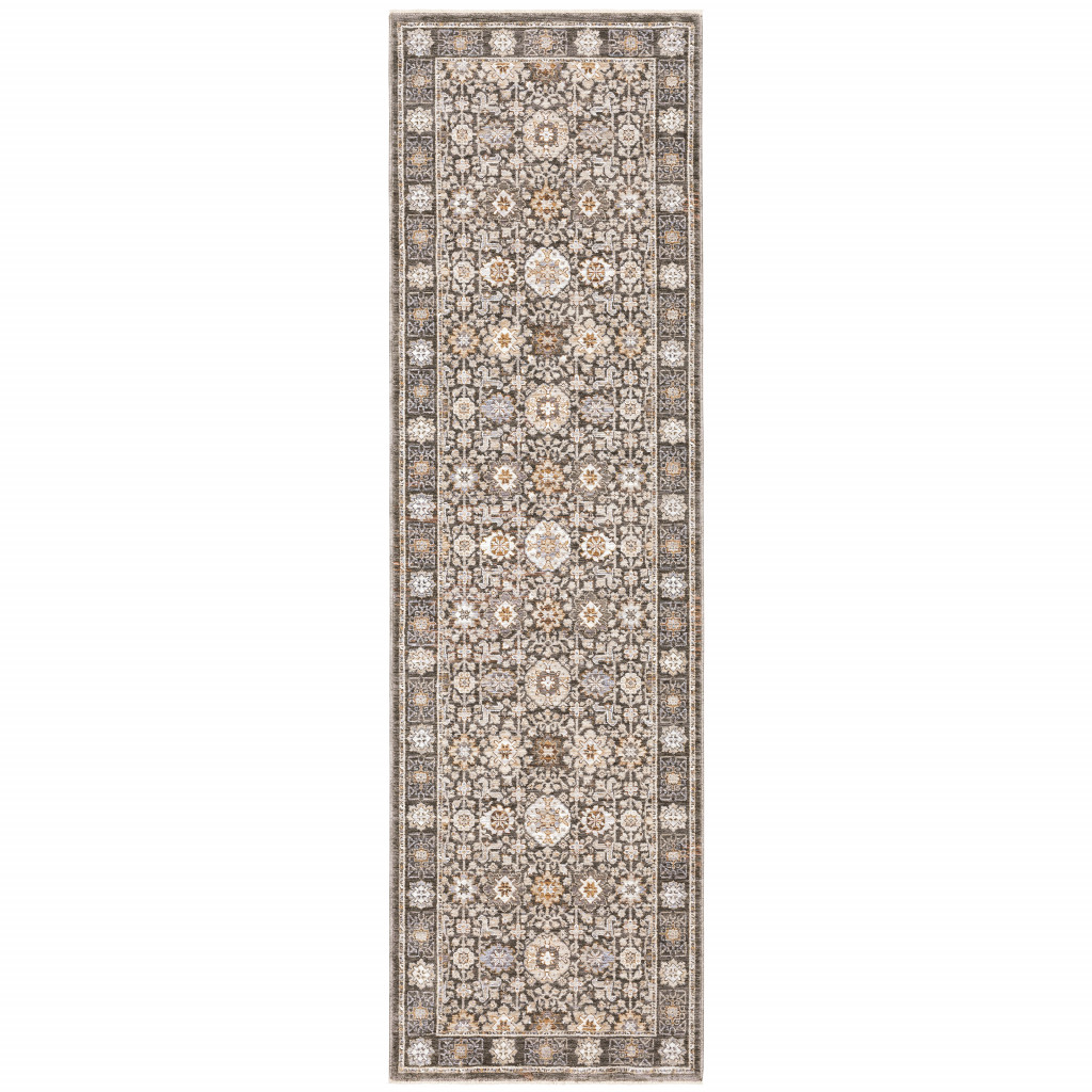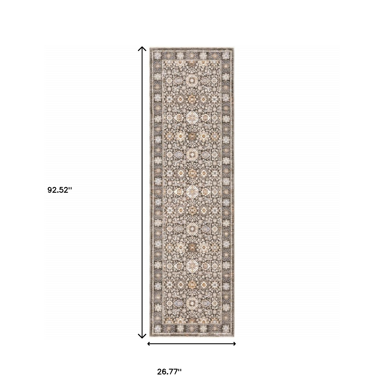 Add great coloration and comfortable texture to your space with this 2' x 8' grey and ivory oriental power loom stain resistant runner rug with fringe. This runner shaped rug features a oriental design in grey and ivory to give it visual interest. A classic shape marries with good looking design for your space Ideal for spaces with kids and pets, this rug is stain resistant to help repel stains and spilled liquids. Tassel ends bring a timeless and fashionable look to your interior. Place this area rug against a hardwood or tile floor and it will enliven your living space with style and sophistication. 0.23" H x 26.77" W x 92.52" D