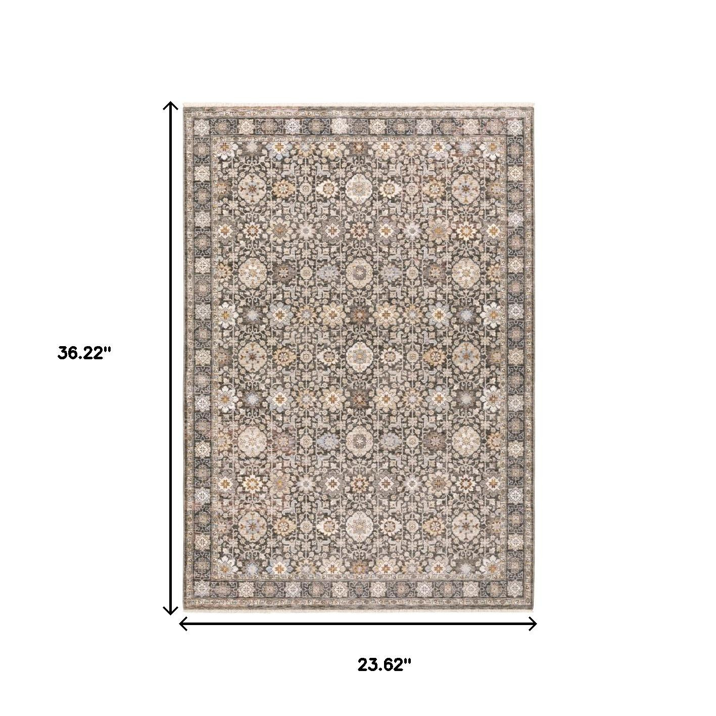 Add great coloration and comfortable texture to your space with this 2' x 3' grey and ivory oriental power loom stain resistant area rug with fringe. This rectangle shaped rug features a oriental design in grey and ivory to give it visual interest. A classic shape marries with good looking design for your space Ideal for spaces with kids and pets, this rug is stain resistant to help repel stains and spilled liquids. Tassel ends bring a timeless and fashionable look to your interior. Area Rugs help to give warmth and sense of home to your space. 0.23" H x 23.62" W x 36.22" D