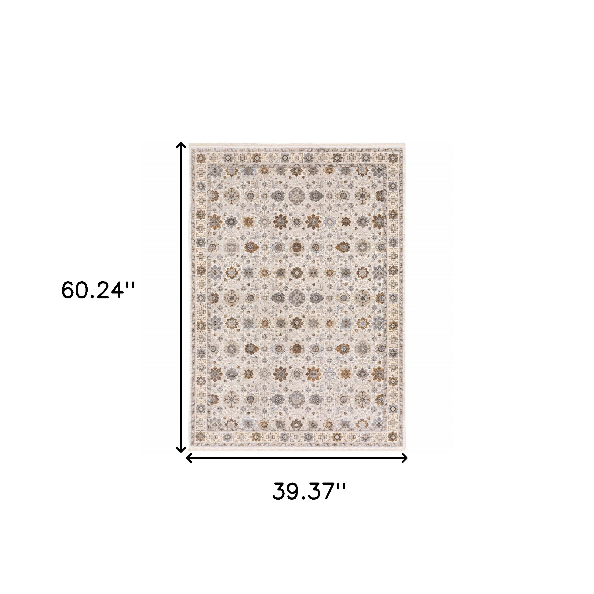 Add some artistry to your room with this 3' x 5' ivory and gold oriental power loom stain resistant area rug with fringe. This rectangle shaped rug features a oriental design in ivory and gold to give it visual interest. A classic shape marries with good looking design for your space Ideal for spaces with kids and pets, this rug is stain resistant to help repel stains and spilled liquids. Tassel ends bring a timeless and fashionable look to your interior. Place this area rug against a hardwood or tile floor and it will enliven your living space with style and sophistication. 0.23" H x 39.37" W x 60.24" D