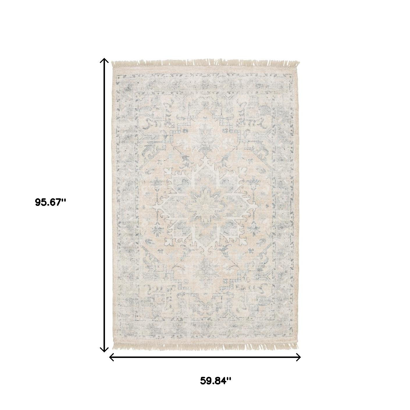 Add great coloration and comfortable texture to your space with this 5' x 8' beige and grey oriental hand loomed stain resistant area rug with fringe. This rectangle shaped rug features a oriental design in beige and grey to give it visual interest. A classic shape marries with good looking design for your space Ideal for spaces with kids and pets, this rug is stain resistant to help repel stains and spilled liquids. Tassel ends bring a timeless and fashionable look to your interior. Crafted by skilled artisans, this hand loomed rug is genuine and unique. No two will be exactly alike. Area Rugs help to give warmth and sense of home to your space. 0.23" H x 59.84" W x 95.67" D