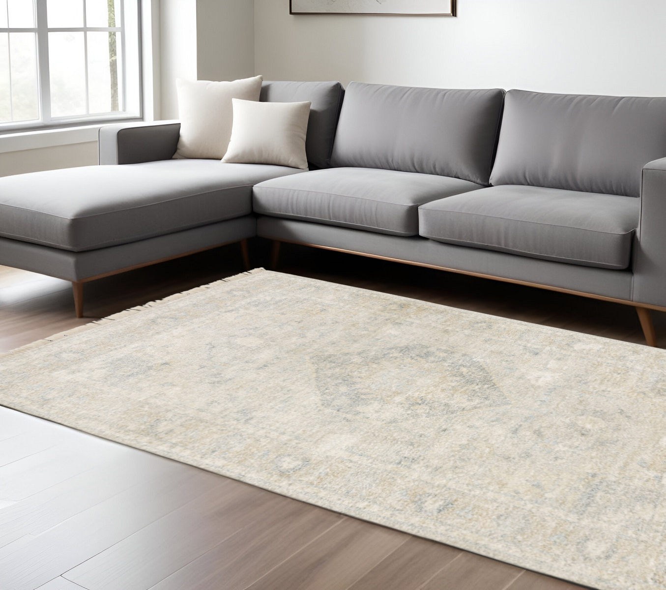 This 10-foot x 13-foot beige and gray oriental hand loomed distressed area rug with fringe, is a great way to add warmth to a room. Ideal for spaces with kids and pets, this rug is stain resistant to help repel dirt and spilled liquids. Crafted by skilled artisans, this hand loomed rug is genuine and unique. No two will be exactly alike. Built to last, this rug crafted from polyester and viscose fibers is known for its durability and long lasting appeal. Rugs are a great way to showcase your style, hide imperfections, warm your home and reduce noise. Tassel ends bring a timeless and fashionable look to your interior. This larger sized, traditional styled rug is ready to create a focal point or statement piece in your room. 119.69-inch h x 155.91-inch w x 0.23-inch d.