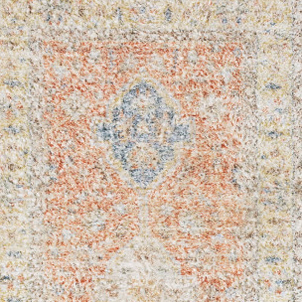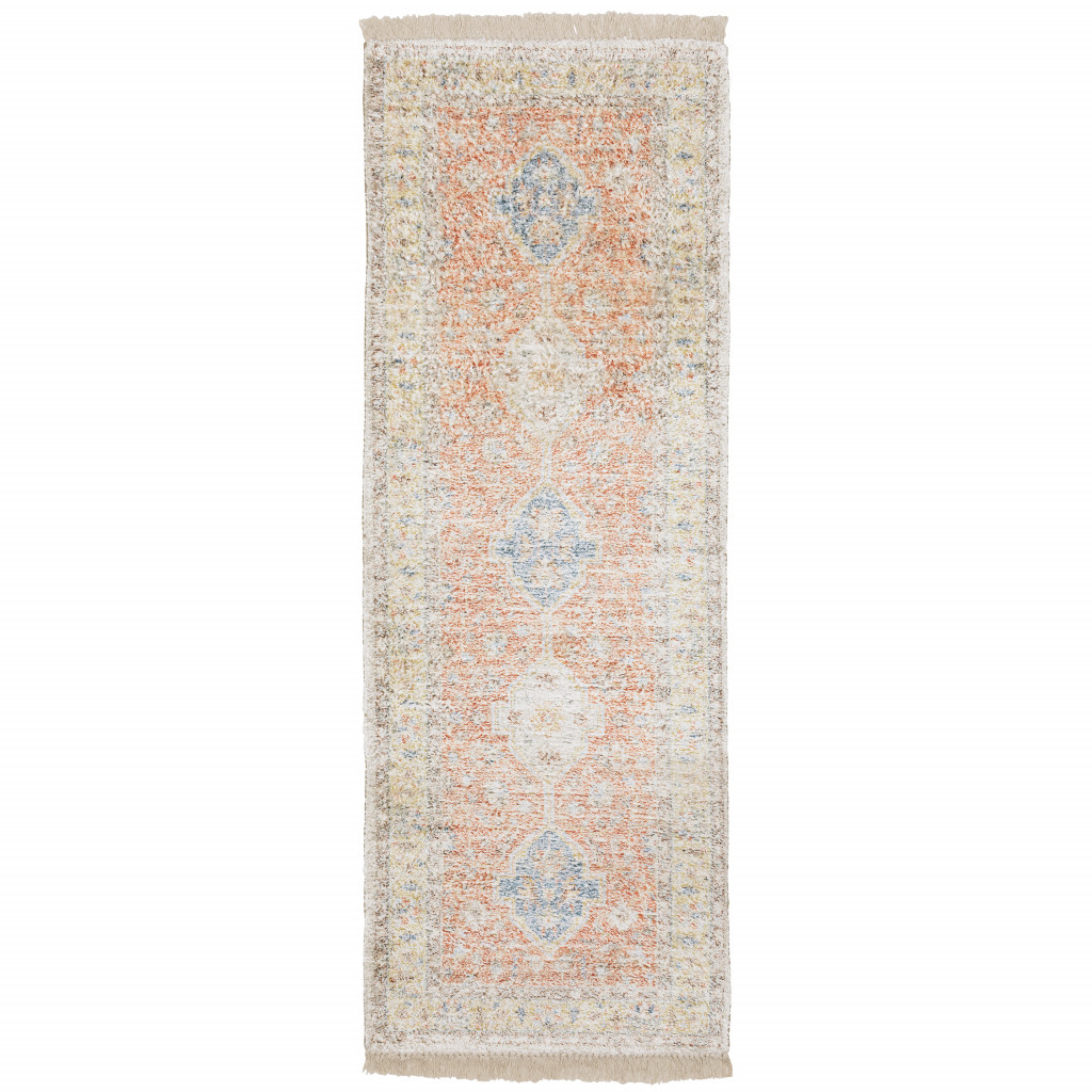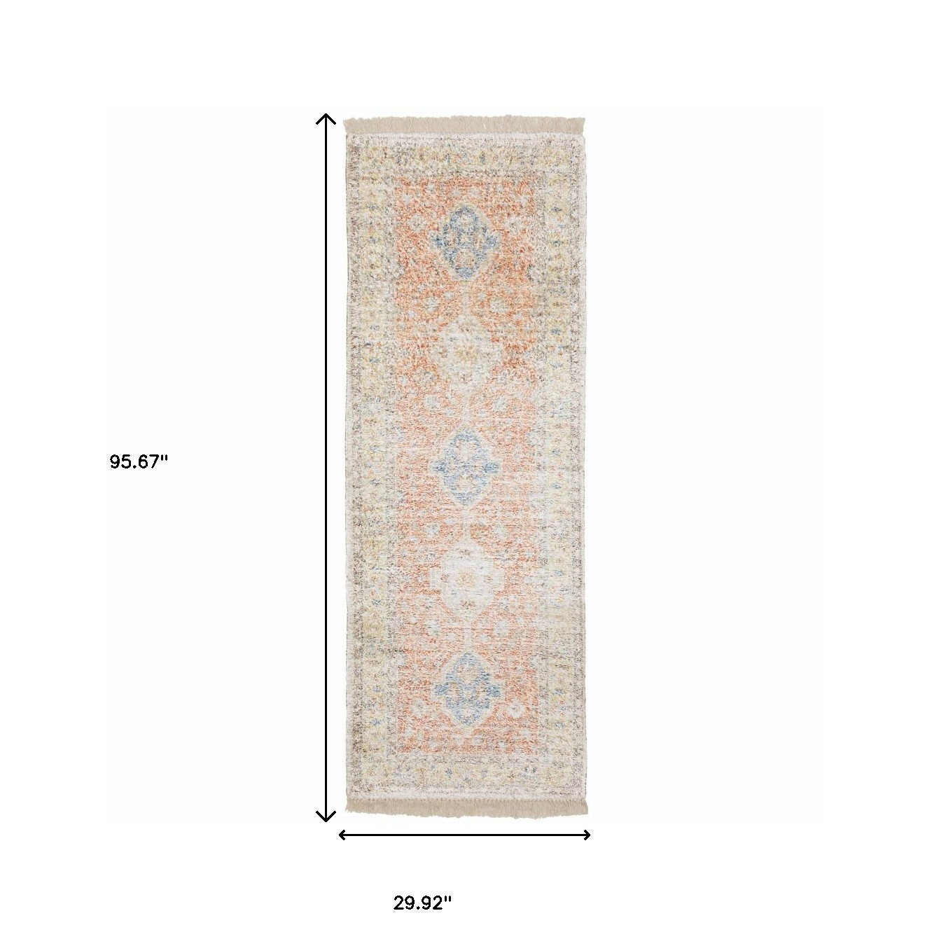 This 8-foot orange and blue oriental hand loomed distressed runner rug with fringe, is a great way to add warmth to a room. Ideal for spaces with kids and pets, this rug is stain resistant to help repel dirt and spilled liquids. Crafted by skilled artisans, this hand loomed rug is genuine and unique. No two will be exactly alike. Built to last, this rug crafted from polyester and viscose fibers is known for its durability and long lasting appeal. Rugs are a great way to showcase your style, hide imperfections, warm your home and reduce noise. Tassel ends bring a timeless and fashionable look to your interior. 29.92-inch h x 95.67-inch w x 0.23-inch d.
