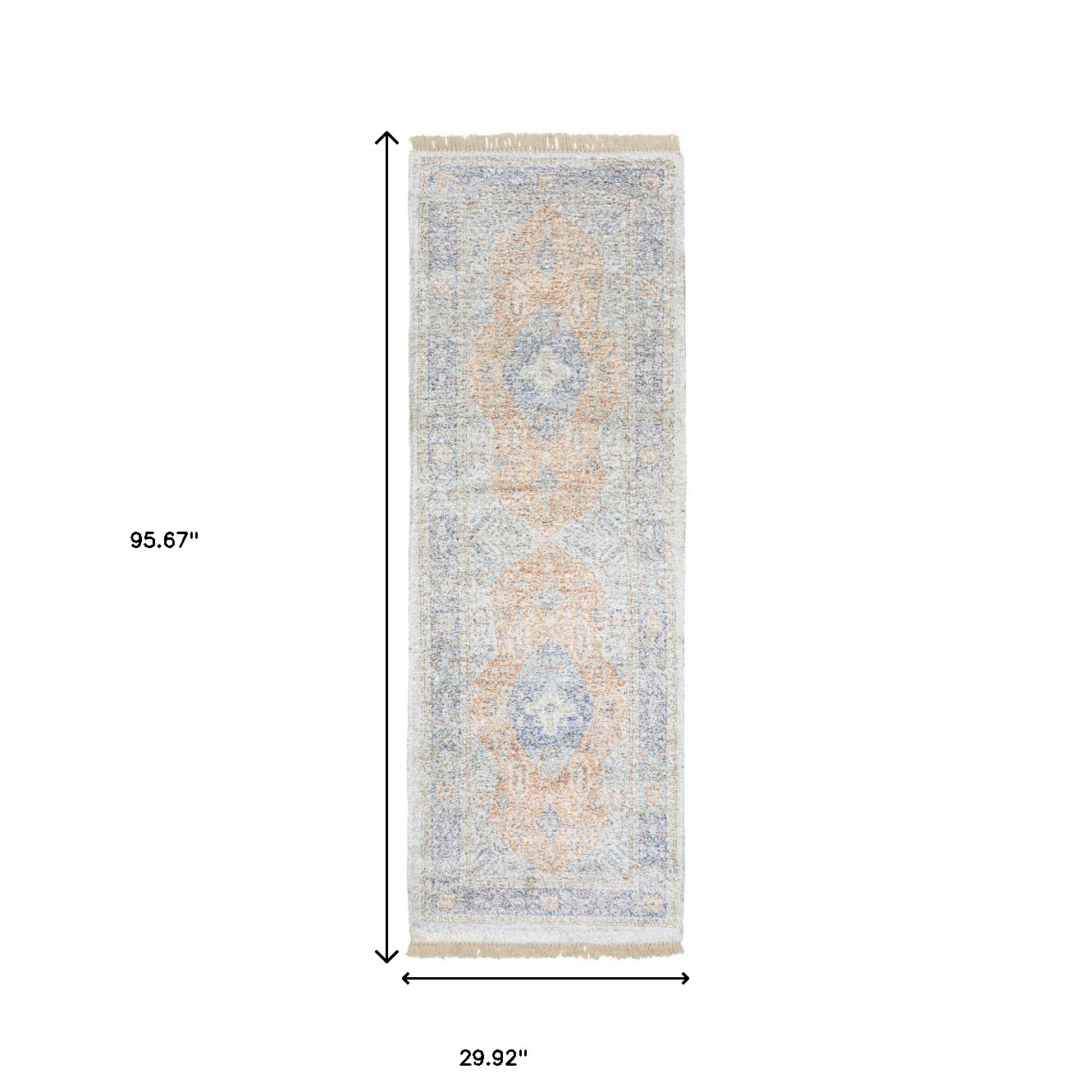 Add great coloration and comfortable texture to your space with this 8-foot blue and red oriental hand loomed distressed runner rug with fringe. Ideal for spaces with kids and pets, this rug is stain resistant to help repel dirt and spilled liquids. Crafted by skilled artisans, this hand loomed rug is genuine and unique. No two will be exactly alike. Built to last, this rug crafted from polyester and viscose fibers is known for its durability and long lasting appeal. Rugs are a great way to showcase your style, hide imperfections, warm your home and reduce noise. Tassel ends bring a timeless and fashionable look to your interior. 29.92-inch h x 95.67-inch w x 0.23-inch d.