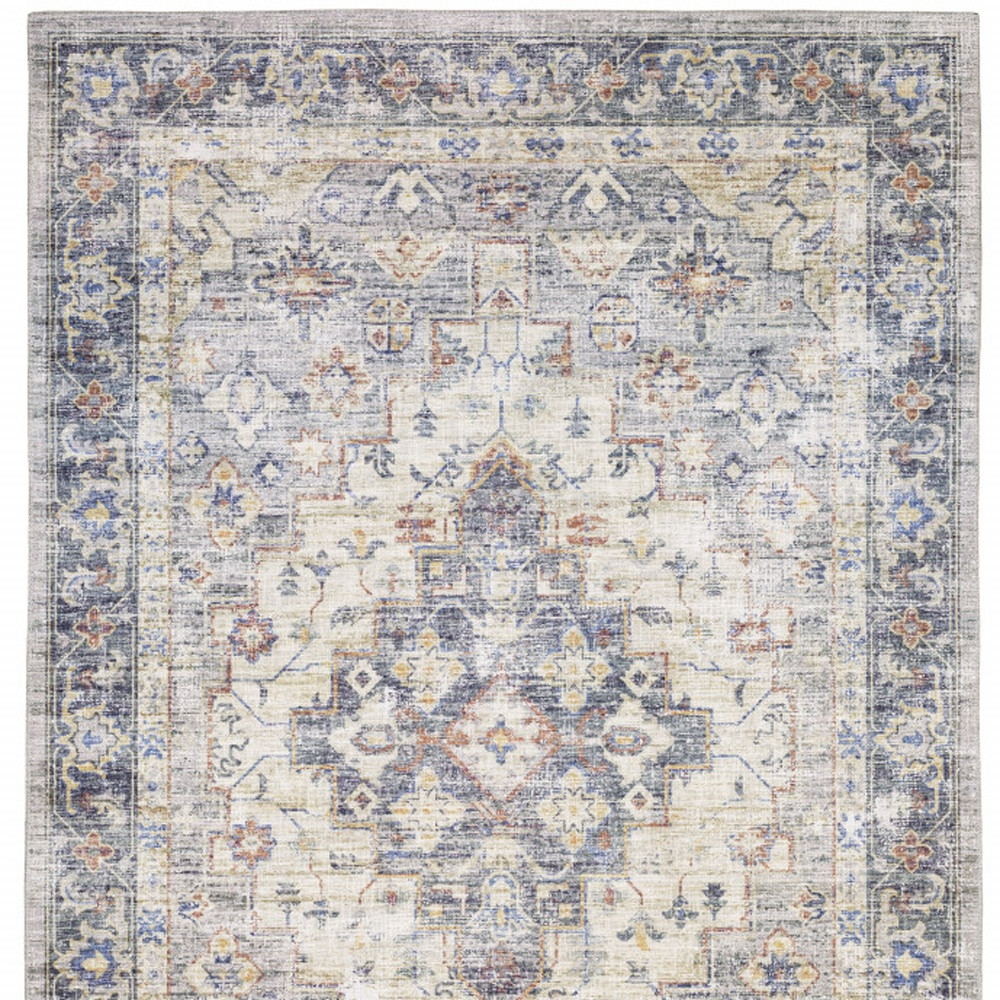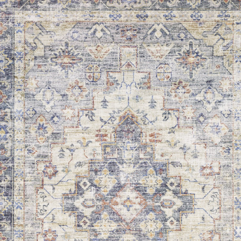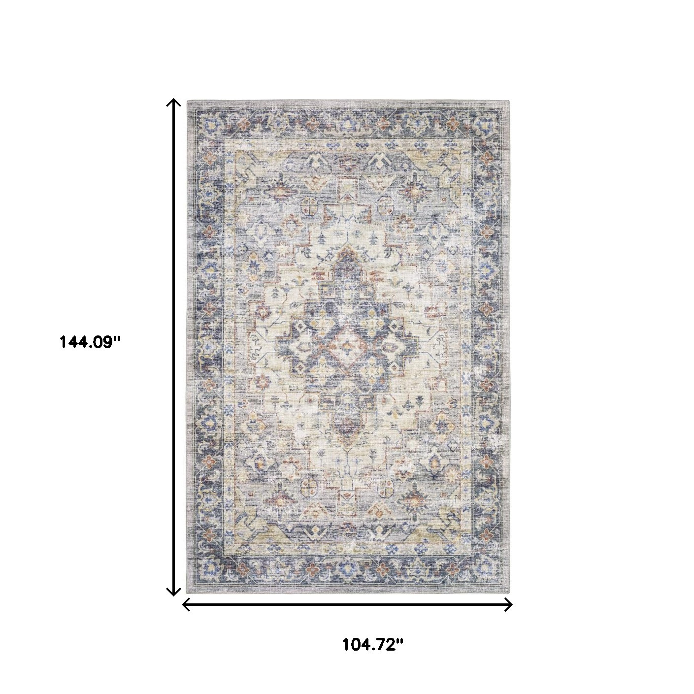 Set an inviting tone in your space with this 9-foot x 12-foot blue and gold oriental distressed area rug. Ideal for spaces with kids and pets, this rug is stain resistant to help repel dirt and spilled liquids. Built to last, this rug crafted from polyester fibers is known for its durability and long lasting appeal. Rugs are a great way to showcase your style, hide imperfections, warm your home and reduce noise. 104.72-inch h x 144.09-inch w x 0.11-inch d.